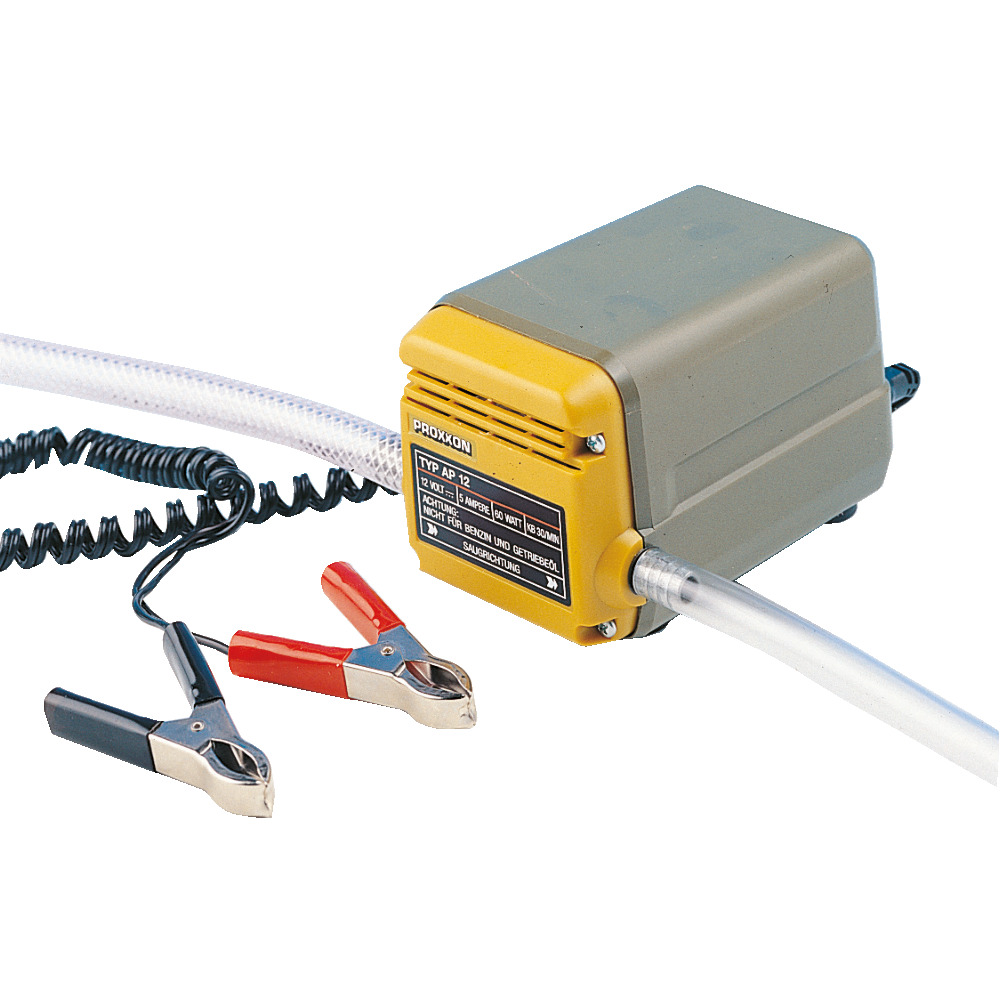 Kreiselpumpe mit Messinglamellen und Untersetzgetriebe. Gleichstrommotor mit Anschlussleitung und Krokoklemmen für 12 V Batterien. Ideal zum Absaugen von Motoröl (Ölwechsel), fördert jedoch auch kleine Mengen von Diesel und Heizöl. Förderleistung max. 5 l/min, komplett.