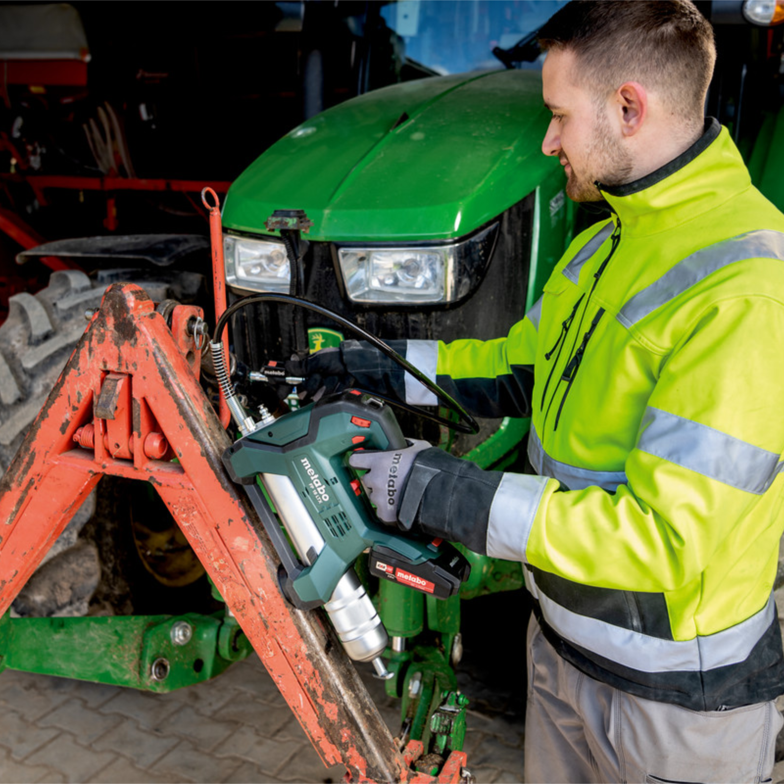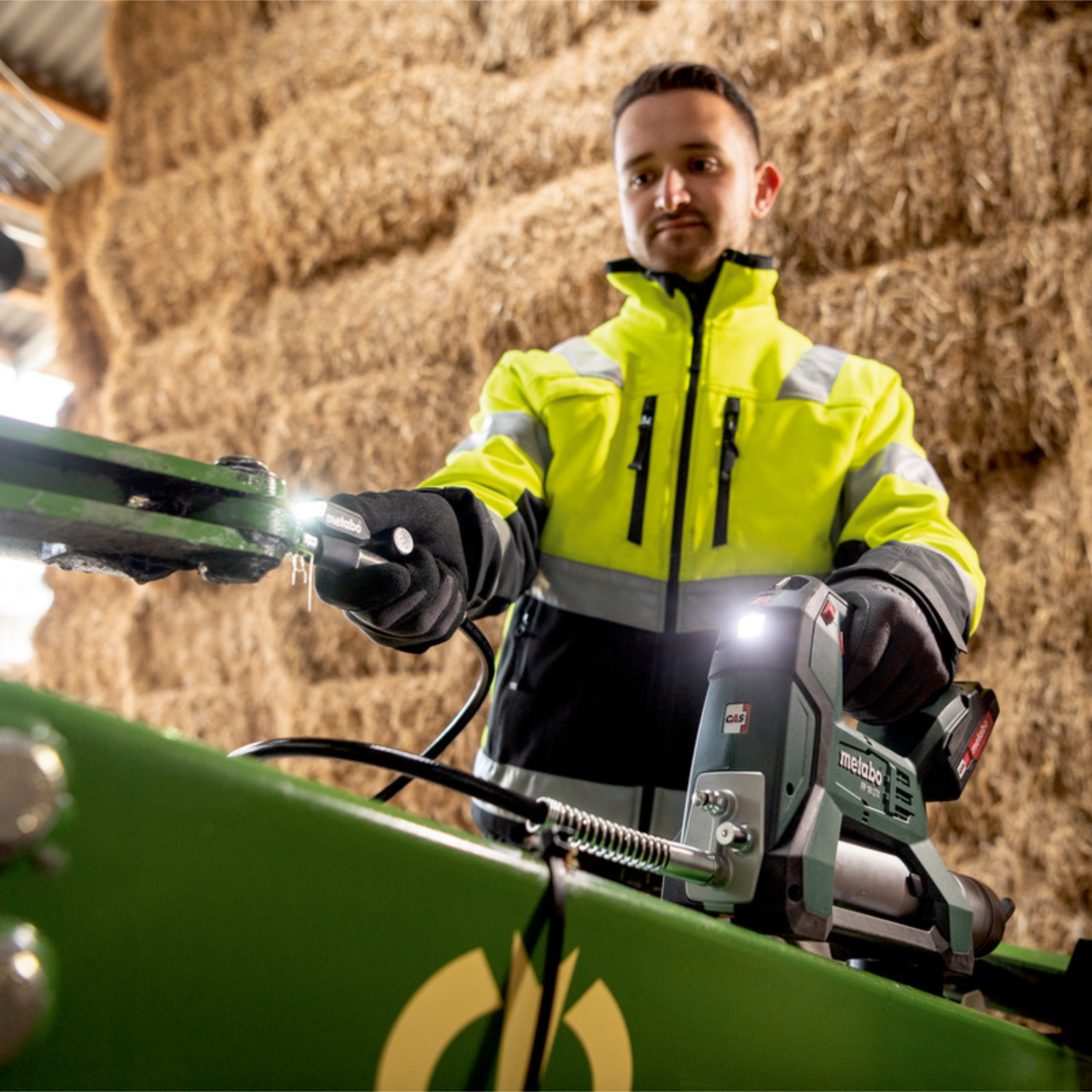 Profi Akku-Fettpresse mit 2 Arbeitsstufen für Auspressdruck bis 690 bar. Die Auspressmenge ist in 10 Stufen einstellbar. Die Presse kann mit Direktbefüllung, Gebinde oder 400 g Standard Fettkartuschen befüllt werden. Keine Luft im Fettraum durch integriertes Entlüftungsventil, optimales Arbeiten durch langen (1200 mm) Schlauch und LED-Lampen am Gerät und beim Mundstück, Magnet und Schultergurt für komfortables Arbeiten. Komplett mit 2x Akku 18 V/2,0 Ah, Ladegerät und Metabox-Systemkoffer.