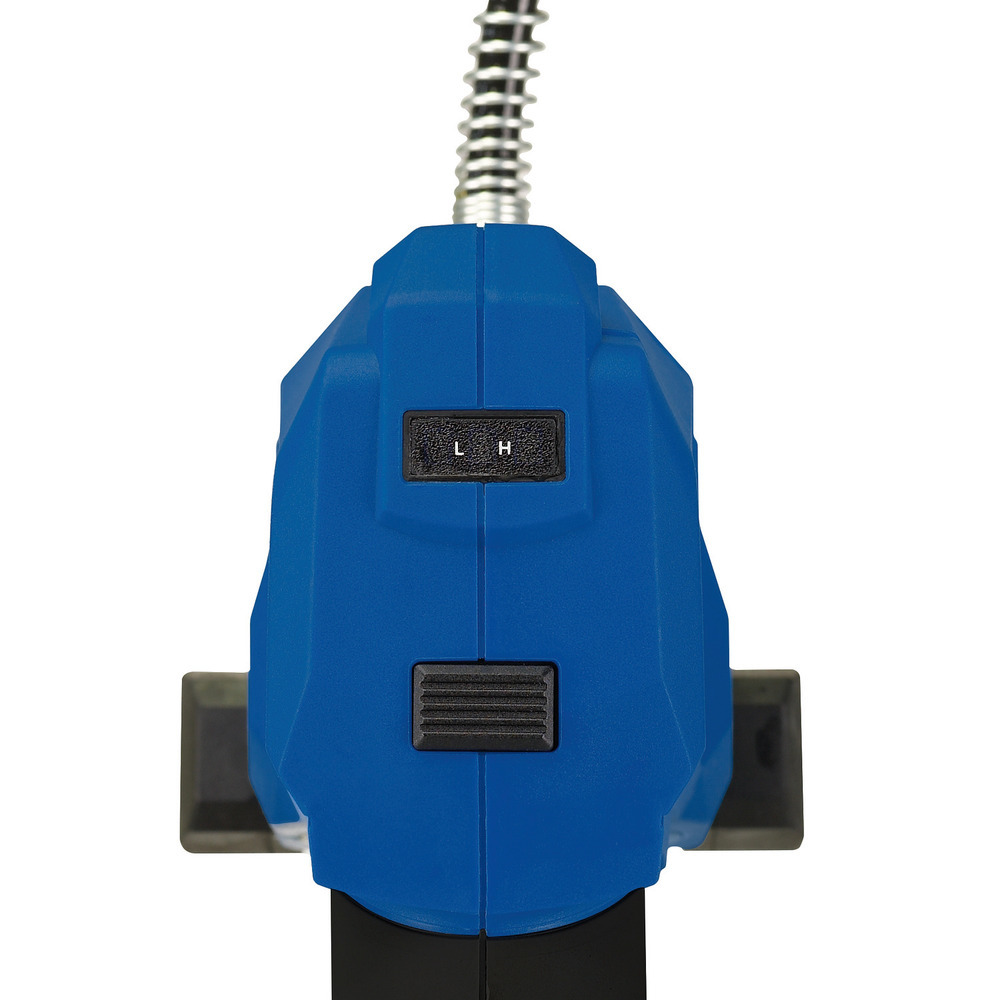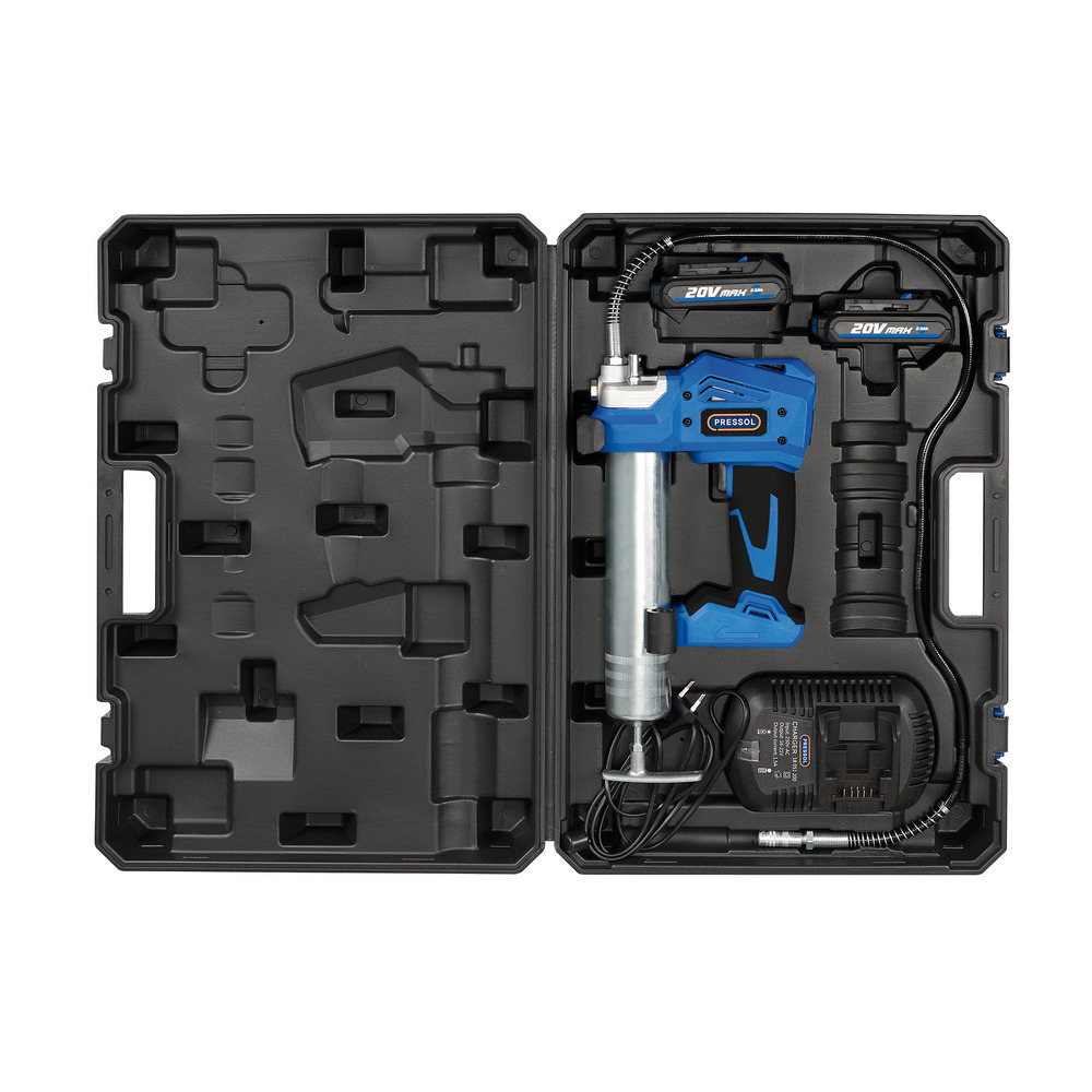Hochwertige, neu entwickelte Fettpresse zum sicheren und komfortablen Fördern von allen handelsüblichen Fetten. . Langer Förderschlauch (1m) auch bei wenig Platz ideal einsetzbar.Kontinuierliche Fett-Förderung – perfekt auch für große Schmierstellen. Geeignet für 400 g-Kartuschen oder loses Fett. Max. Druck: 680 bar, Fördermenge: ca.150 g/min, Gewicht: 3,56 kg. Komplett mit Ladegerät (1 Std.), 2 Akkus 20 V/2,0 Ah, Schlauch, Rohr, Mundstück und Transportkoffer. 2 einstellbare Fettfördergeschwindigkeiten.Fördermenge/Akkuleistung: ca. 25 Kartuschen 400 g ohne Gegendruck, ca. 7 Kartuschen bei 100 g Gegendruck.Mit LED Licht am Fettpressenkopf, weichem Griff, sowie Standfuß und Schlauchhalter.