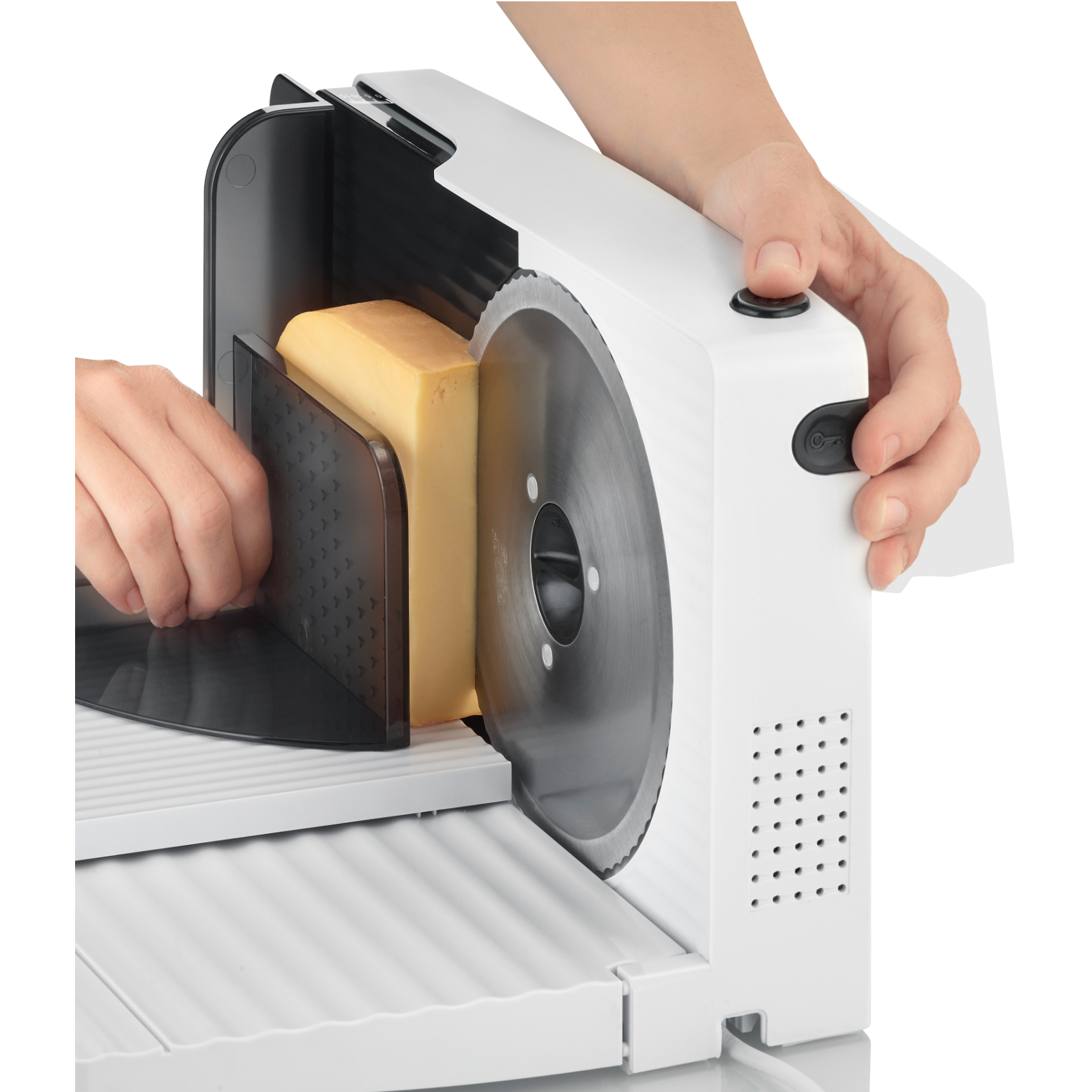 Mit einer kraftvollen Schnittleistung bietet der Allesschneider Präzision bei jedem Schnitt, von hauchdünnen Scheiben bis zu dickeren Schnitten. Sein klappbares Design ermöglicht eine einfache Aufbewahrung, selbst in den kleinsten Küchen, und die weiße, schlanke Optik fügt sich nahtlos in jedes Küchendesign ein.