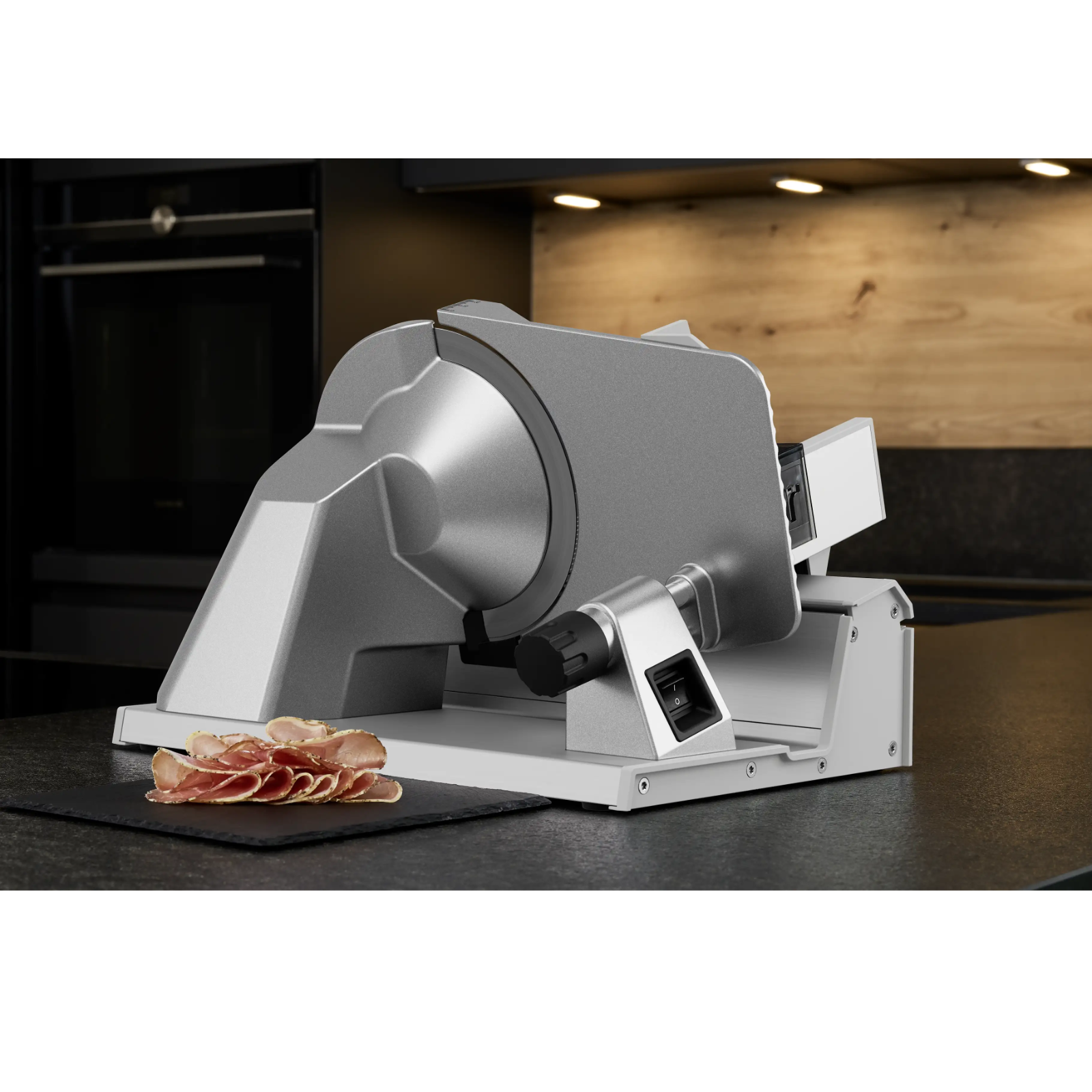 Mit seiner herausragenden Präzision und mühelosen Handhabung, besonders hervorzuheben ist das extra große, glatte Schinken-/ Aufschnittmesser, meistert dieser Allesschneider jede Herausforderung. Ob Brot, Wurst, Käse, Gemüse oder sogar größere Lebensmittelstücke, der Tondo13 schneidet durch seine besonders großen Messer alles sauber und effizient.