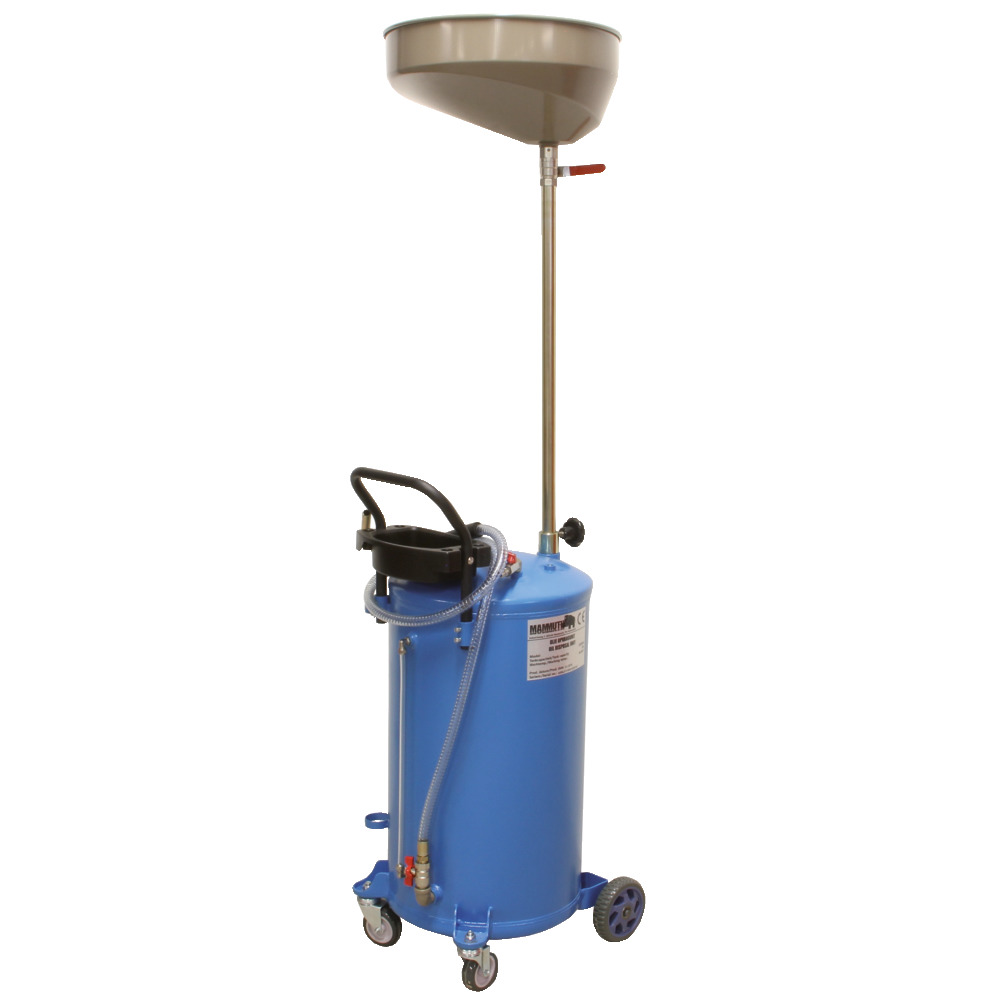 Praktischer, fahrbarer Auffangbehälter mit 65 L Inhalt. Komplett mit Sicherheitsventil, Manometer und Auslaufschlauch für einfache Entleerung mit Druckluft. Auffangschale mit 16 L Inhalt und Absperrhahn auf höhenverstellbaren Rohr für einfaches und sauberes Arbeiten.