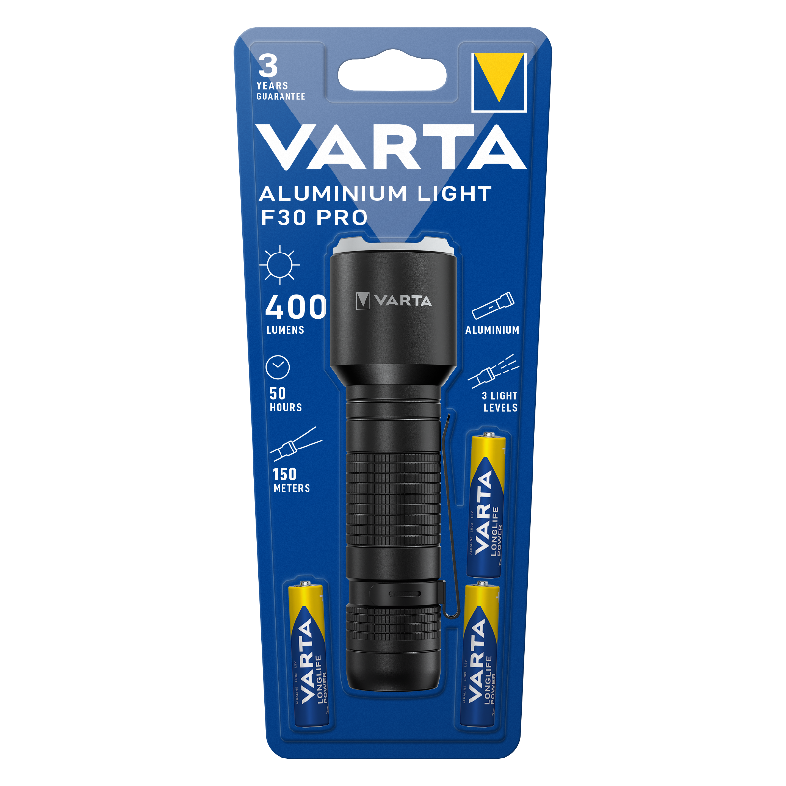 Elegante Taschenlampe mitschwarz eloxiertemAluminiumgehäuse und silbernemRing mit matter Oberfläche und 3Leuchtmodi, hoher Lichtleistungund langen Laufzeiten,strukturierter Gehäuseoberfläche für maximalen Grip. Die VARTA Aluminium Light F30 Pro verfügt über einen Spot to Flood Mechanismus für präzisen Fokus oder einen weiten Winkel.3 Jahre VARTA Garantie
