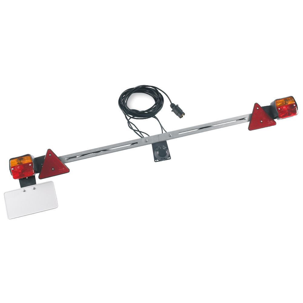 Komplett mit Schluss-, Brems-, Blink- und Kennzeichenbeleuchtung, 7,5 m Anschlusskabel, 2 Dreieck-Rückstrahler, mit Stecker und Steckdose, Kennzeichenschild, mit Birnen, komplett verkabelt, verstellbar: 1,3 - 1,7 m. Inklusive Schlagschutz.
