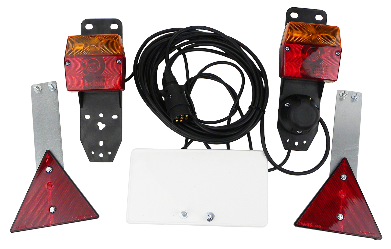 Mit 7,5 m Anschlusskabel sowie Schluss-, Brems-, Blinkleuchte, Kennzeichenbeleuchtung, 2 Stk. Dreieckrückstrahler, Kennzeichenschild, incl. Birnen, max. Breite 2,2m