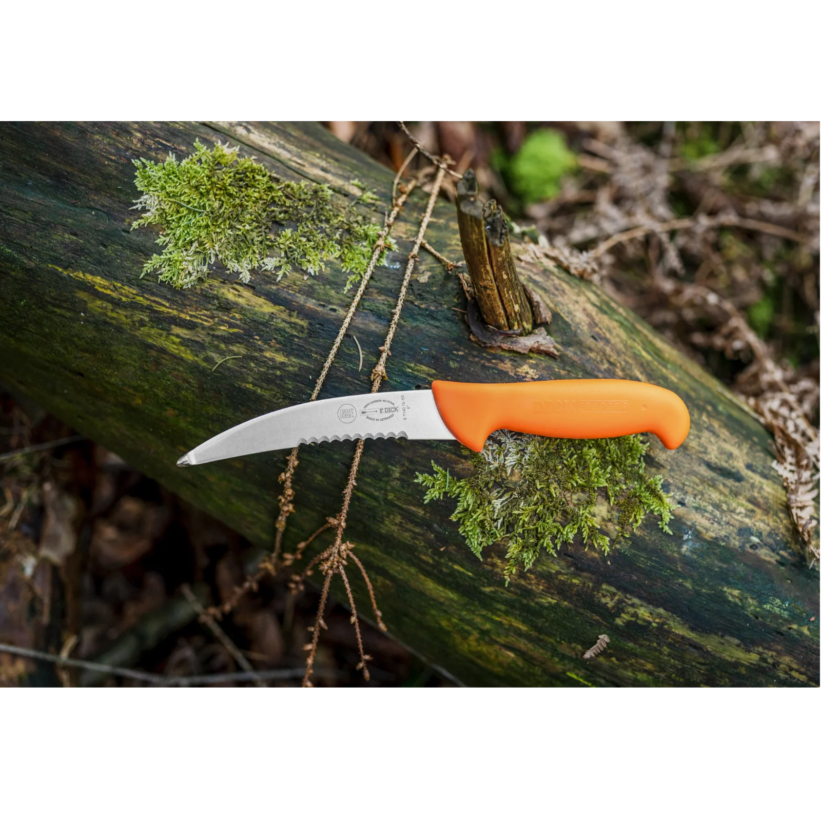 Das Gekrösemesser mit der 150 mm langen Klinge ist mit einem Sägeschliff (Anschnittwelle) versehen und hierdurch hervorragend zum Auftrennen von Knochennähten (z. B. Brustbein und Schloss) geeignet. Die stumpfe Kugelspitze verhindert ein unbeabsichtigtes Verletzen der Innereien. Der ergonomisch geformte Messergriff in Orange erleichtert die Wiederauffindbarkeit im Wald bzw. Gelände.
