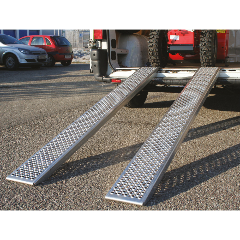 Verladerampe für Anhänger, Transporter,... aus Aluminium (per Paar).Tragfähigkeit bei Breite 200 mm: max. 400 kg/Set, bei Breite 260 mm: max. 900 kg/Set. (Max. Gewicht auf 4 Räder bei gleichmäßiger Verteilung).