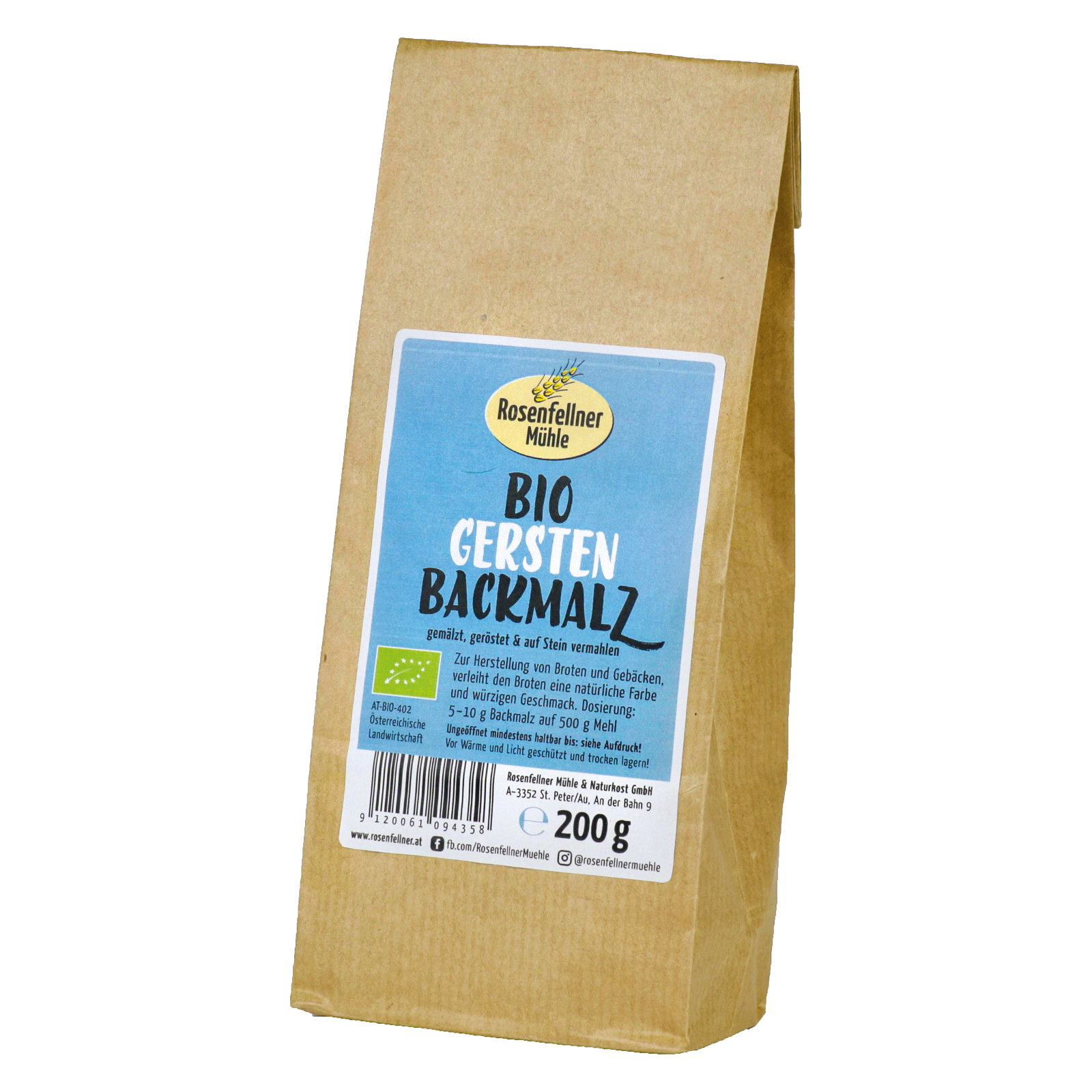 Das Bio-Gersten-Malz sorgt für eine saftige Krume, schöne Bräunung, bessere Teigreifung und längere Frische von hellen Broten und Gebäck wie Semmerl, Salzstangerl, usw....Durch die Beigabe von Backmalz zum Teig werden der Hefe besser verwertbare Nährstoffe wie Zuckeroder Aminosäuren zur Verfügung gestellt. Es kommt weiters zur Beschleunigung der Gärung und einerbesseren Teigbeschaffenheit.Dosierung: 5 - 10 g Backmalz auf 500 g Mehl.Inhalt: 200 g.enthält Gluten.