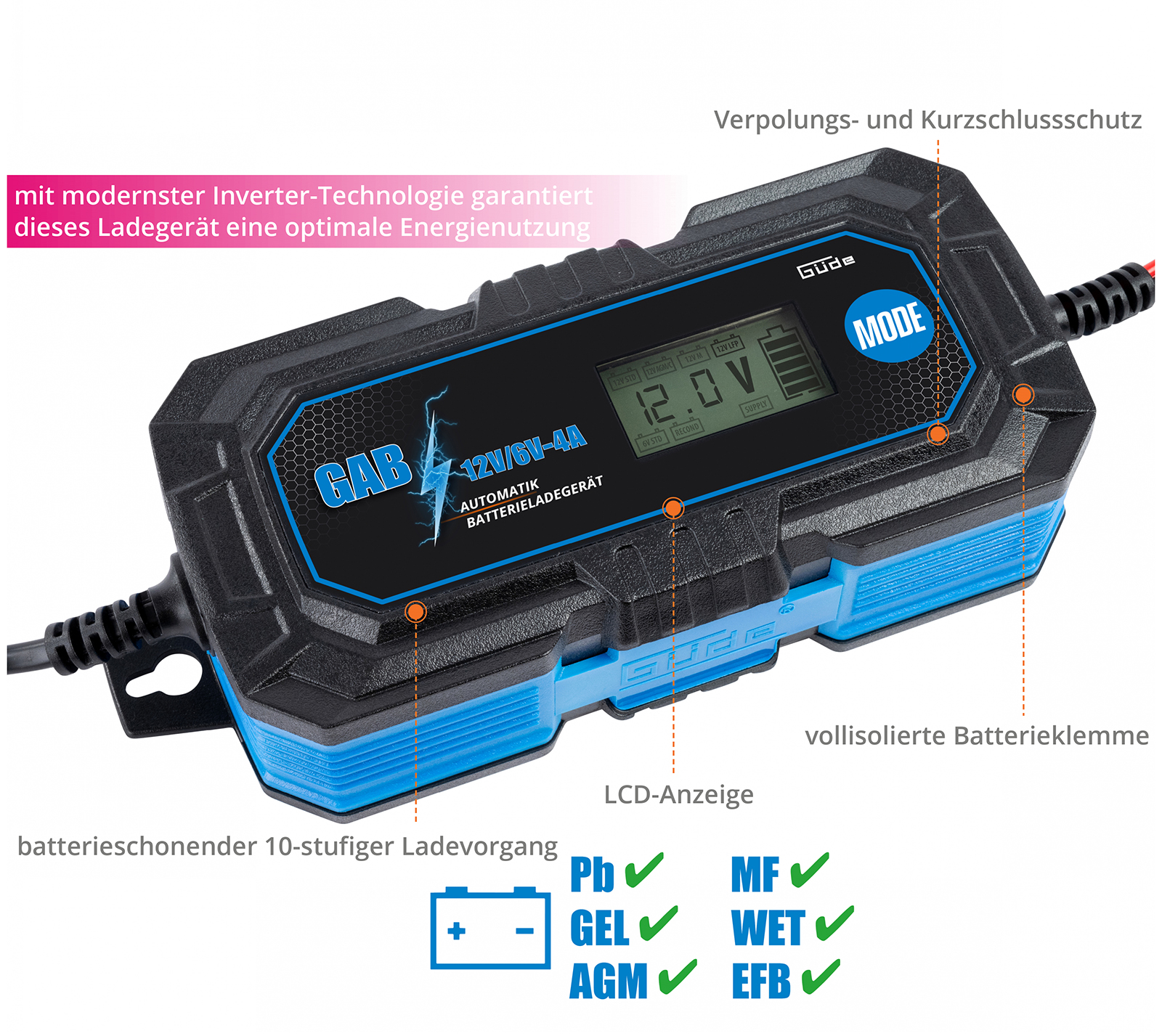 Für alle gängigen Batterien wie PB, GEL; AGM; WET und LiFePO4.