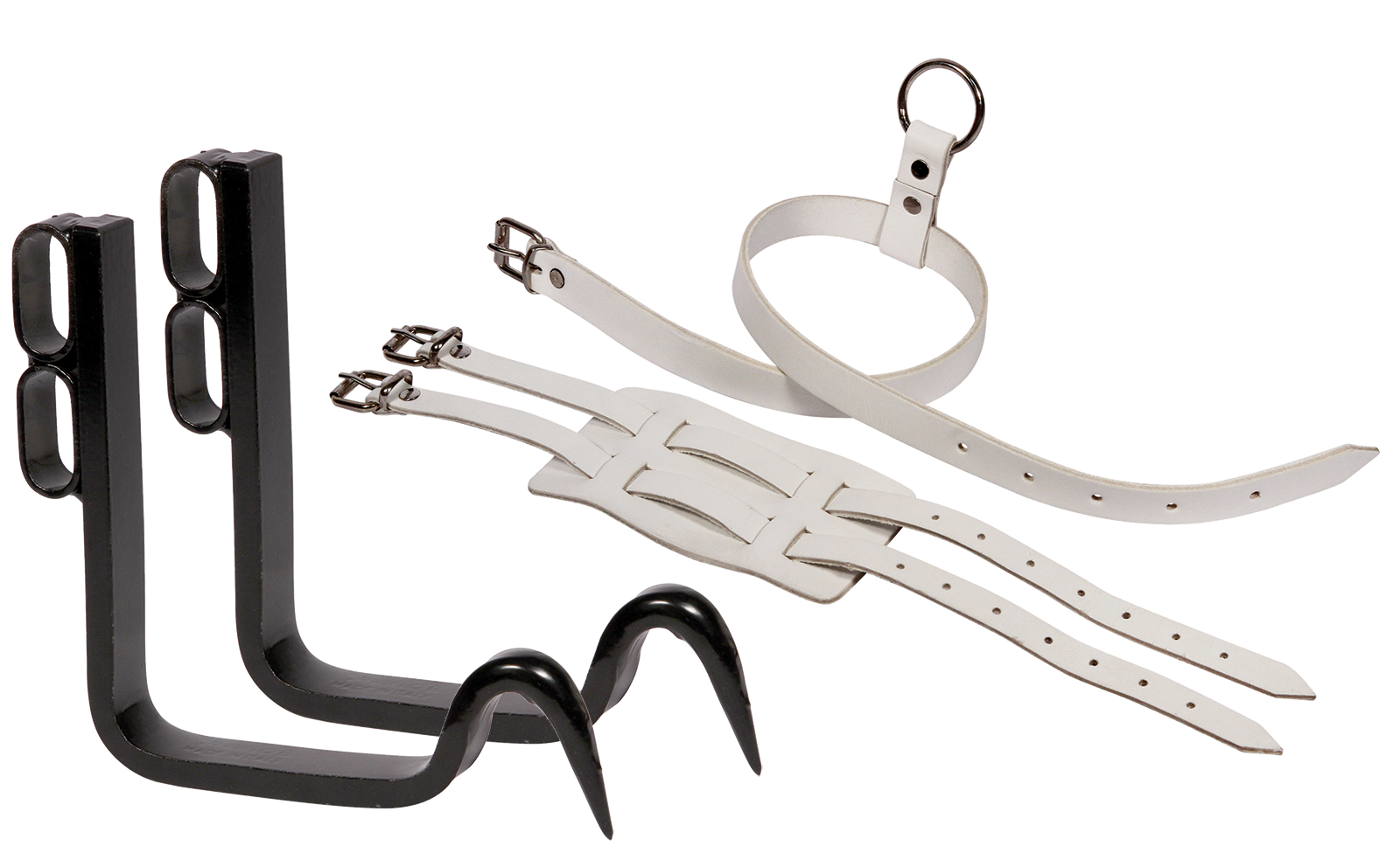 Baumsteigeisen mit einem Haltezahn und kurzem Schaft, werden mit Lederriemen fest am Bein fixiert. Baum Klettereisen verwendbar mit allen festen Arbeitsschuhen, einfach und rasch zu befestigen,Gewicht 1,67 kg/Paar.Steigeisen gelten nicht als PSA und müssen immer mit einem Höhensicherungsgerät kombiniert werden.