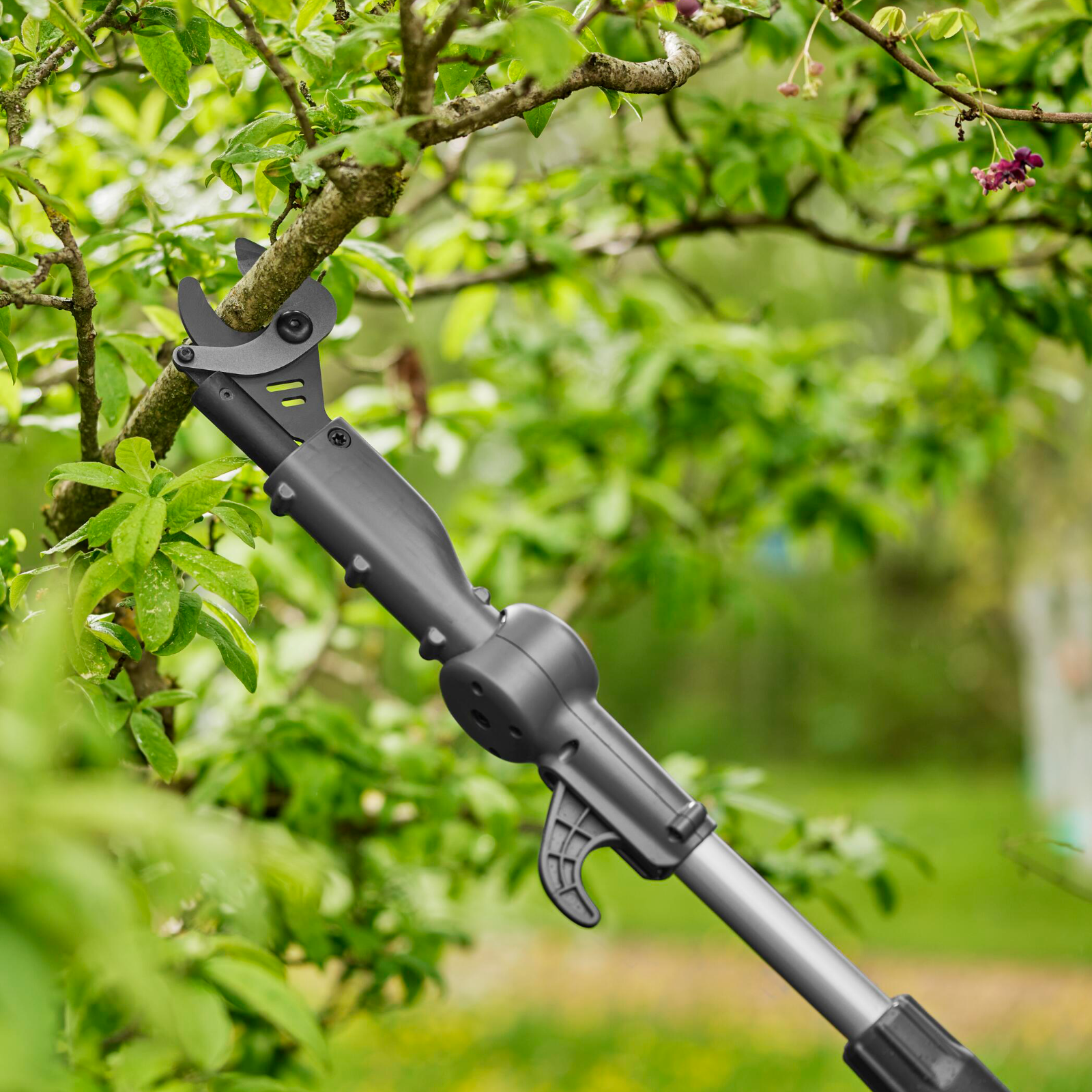 Wenn es um Schnitte in größeren Höhen geht, greifen Gärtner zur HighCut Akku-Teleskop-Baumschere mit fünf Metern Arbeitshöhe.Damit gelingt der Baumschnitt mühelos auf Knopfdruck und dank der großen Reichweite von fünf Metern Arbeitshöhe benötigen Gartenfreunde zudem keine Leiter.Der Pflege- und Erhaltungsschnitt von großgewachsenen Bäumen lässt sich ganz bequem und mit sicherem Stand vom Boden aus erledigen.Die schlanke Form der Akku-Baumschere macht das Manövrieren im dichten Geäst besonders einfach. Beste Ergonomie und Gewichtsverteilung sowie große Griffbereiche ermöglichen einen besseren Halt und eine bequeme Arbeitsposition. Auf Knopfdruck schafft die Astschere bis zu 200 Schnitte mit einer Akkuladung.LEDs im Griff zeigen deutlich den Ladezustand des Akkus an. Die Akku-Baumschere hat eine präzisionsgeschliffene, antihaftgehärtete Stahlklinge für saubere und schonende Schnitte. Mühelos und ohne Kraftaufwand werden Äste bis zu einem Durchmesser von 28 Millimetern sauber geschnitten. Der abgewinkelte Schneidkopf der HighCut-Teleskopmodelle bietet stets freie Sicht auf den Arbeitsbereich. Mit dem Entastungshaken lässt sich verfilztes Schnittgut leicht aus der Baumkrone ziehen. Die Teleskopmodelle verfügen jeweils über einen teilbaren Schaft zur platzsparenden Aufbewahrung oder zum unkomplizierten Transport.Technische Daten:Teleskopstiel in 40 cm-Schritten bis zu einer Arbeitshöhe von 5 mSchnittdurchmesser: max. 28 mmpräzisionsgeschliffene, antihaftbeschichtete Klingen aus gehärtetem Stahl, made in Germanyabgewinkelter SchneidkopfRäumhaken zum Entfernen von festsitzendem SchnittgutLaufzeit: bis zu 200 SchnitteGewicht: 4,1 kgLänge: 3,20 bis 3,60 mLED-Ladestandsanzeigezweiteiliger, teilbarer Schaft für einfachen Transport und LagerungSystemakku 18 V, 2,0 Ah, Ladegerät