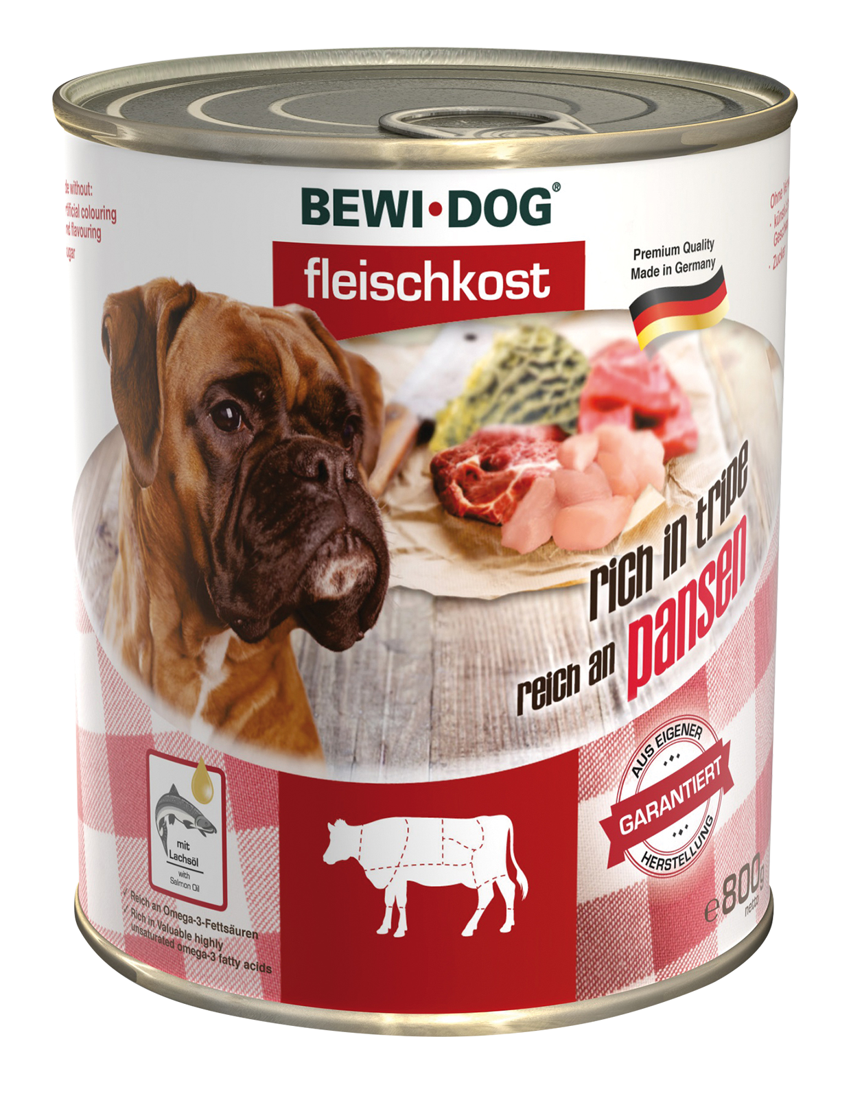 BEWI DOG® Nassfutter Fleischkost enthält saftiges Muskelfleisch mit einer festen Fleischstruktur. So, wie es Hunde lieben. Die vielen Geschmacksvarianten sorgen für eine willkommene Abwechslung.