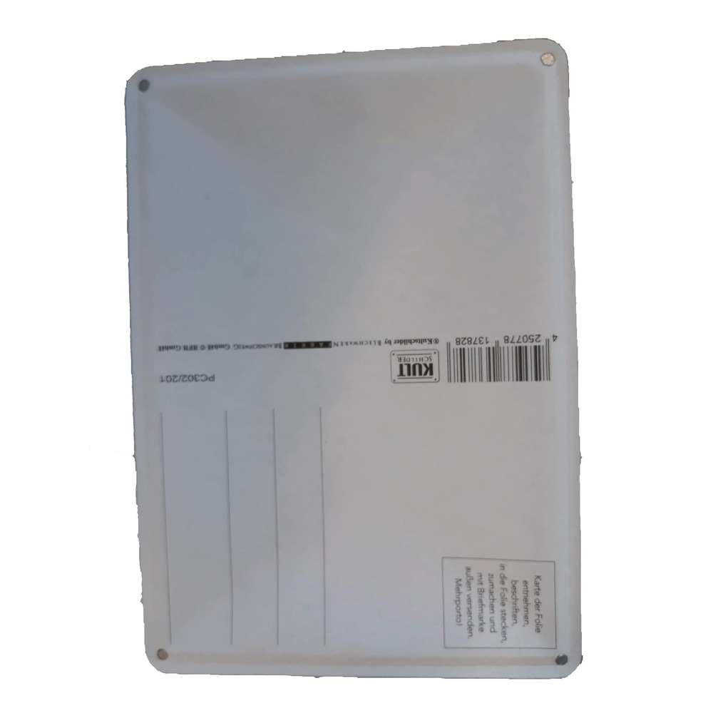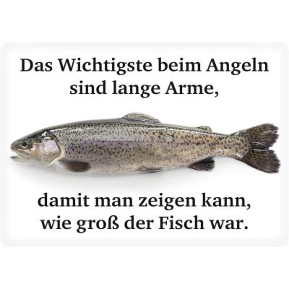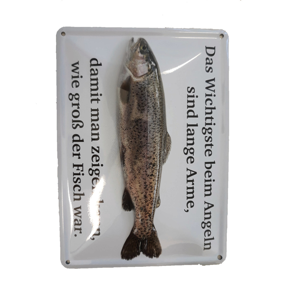 Blechschild mit 4 Randlochungen. Spruch: Das Wichtigste beim Angeln sind lange Arme damit man zeigen kann, wie groß der Fisch war. Auch als Postkarte zu verwenden - siehe Rückseite. Maße: 15x10,5 cm.