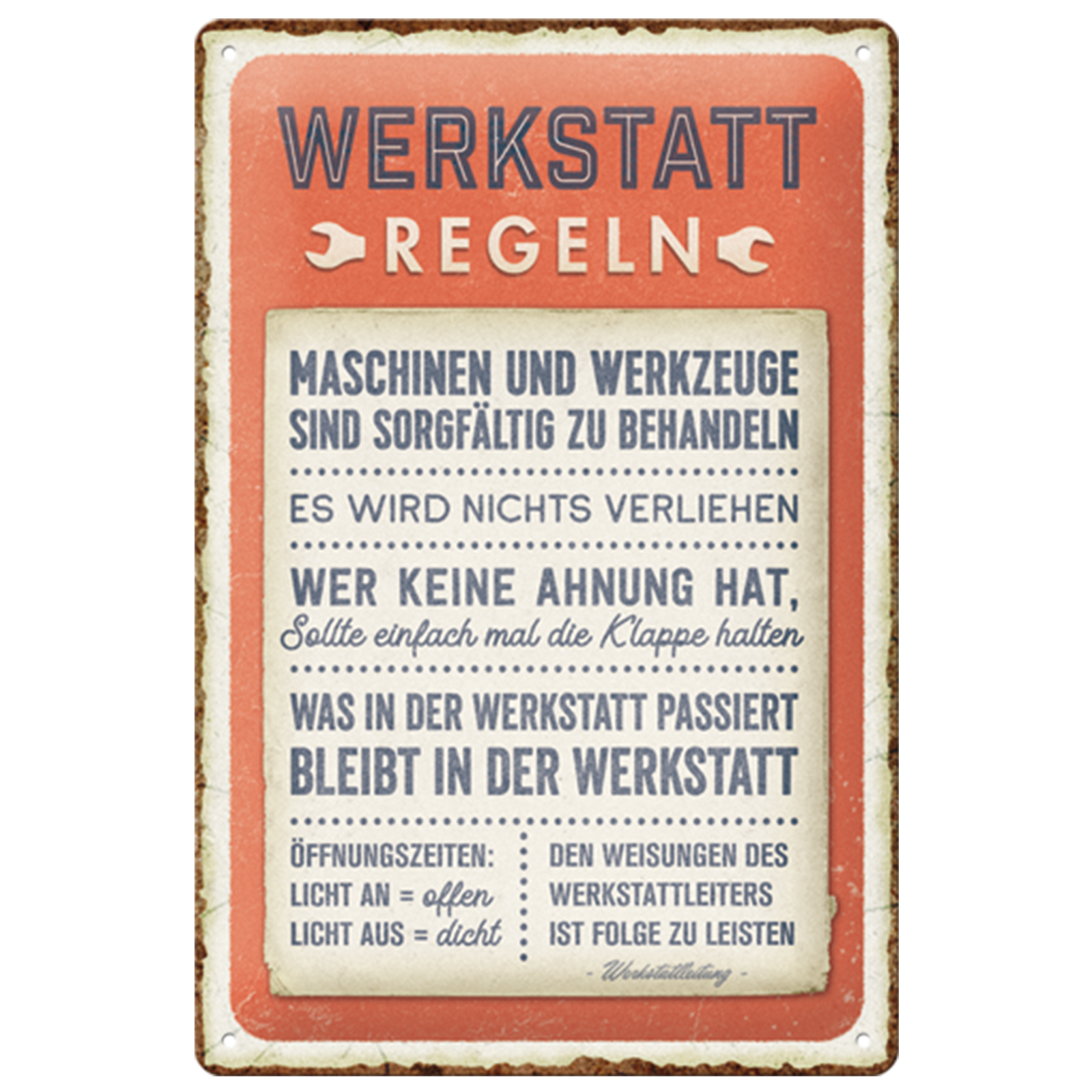 Ihre Werkstatt ist Ihr Reich. Ein Ort, an dem gearbeitet, geschraubt und getüftelt wird. Damit die Stimmung dabei locker bleibt und trotzdem jeder weiß, was Sache ist, gibt es unser Blechschild Werkstattregeln . Dieses Schild ist mehr als nur Deko: Es ist eine humorvolle Anleitung, die Ordnung schafft und gleichzeitig für ein Schmunzeln sorgt.Maße: 20x30cm