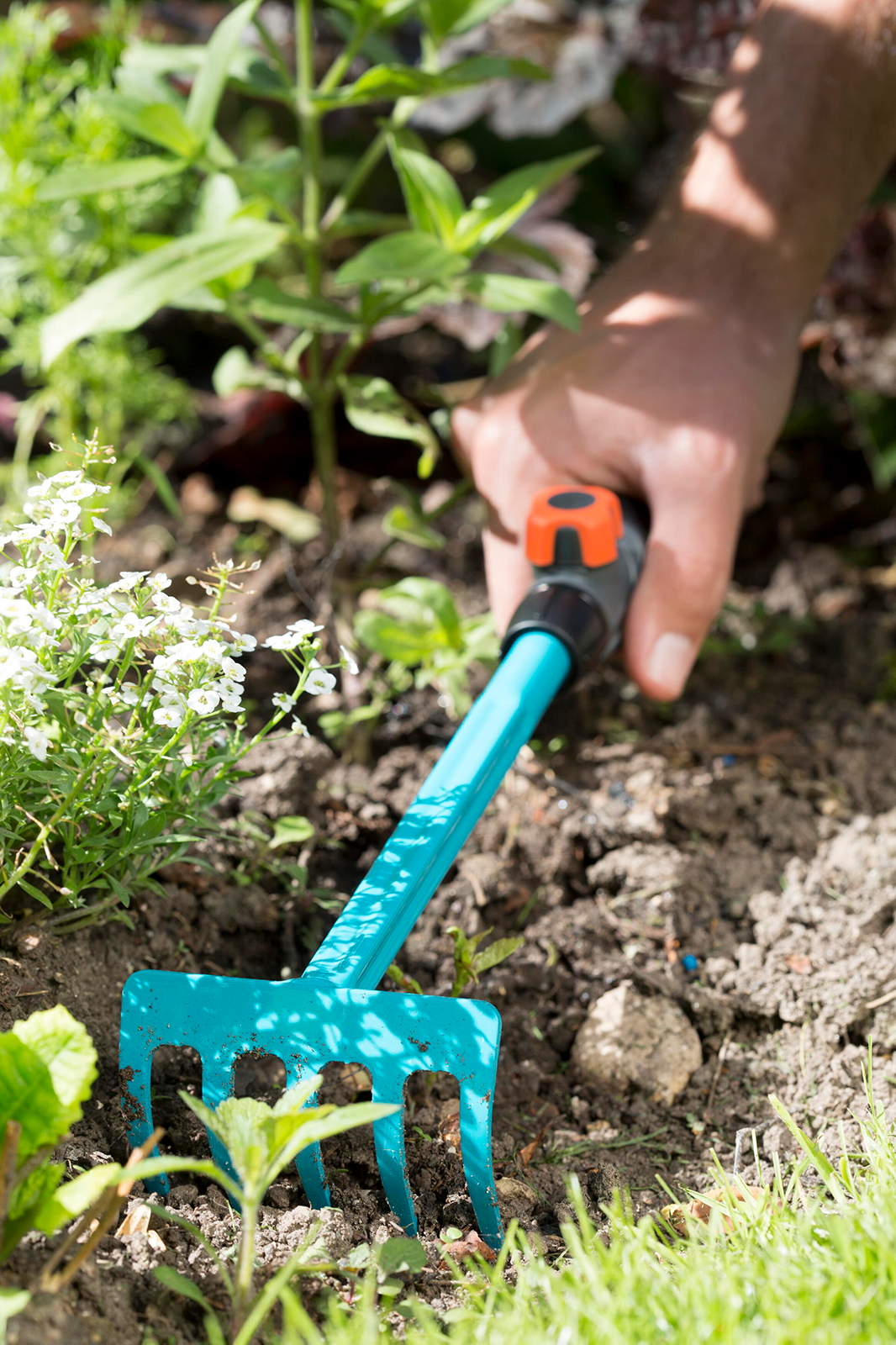 Mit dem GARDENA combisystem-Blumenrechen mit Handgriff kannst Du optimal den Boden säubern, lockern und glätten.