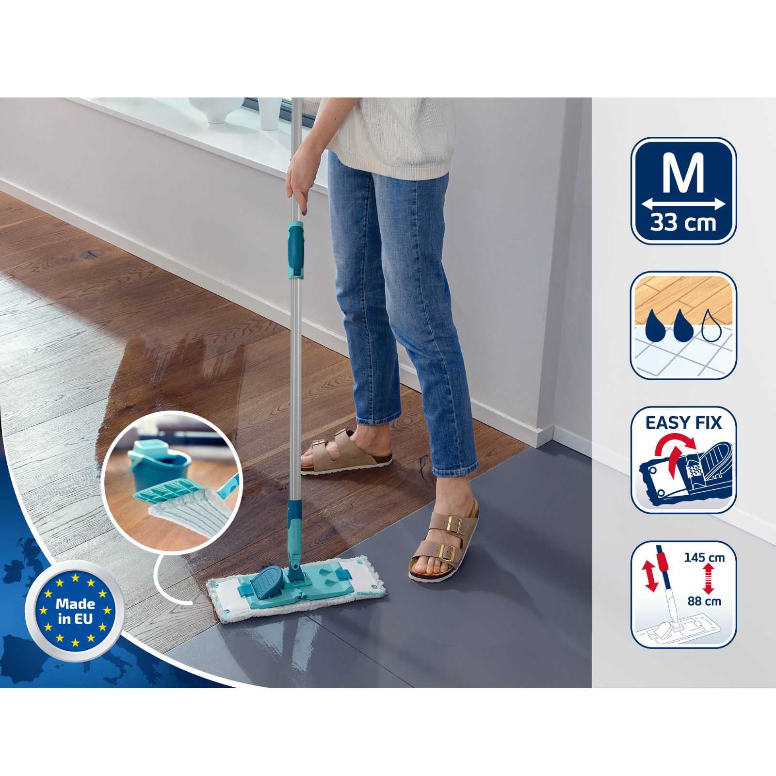 Wischbezug micro duo für das Set CLEAN TWIST M ergo/Power Clean MLanglebiger und nachhaltiger Wischbezug: micro duo bei 60 °C bis zu 200x in der Waschmaschine waschbarReinigungsstarkes 2-Faser-System aus Microfaser mit leicht erhöhten Borsten für die gründliche Reinigung aller BodenartenBesonders hohe Aufnahme von Schmutz und SchmutzwasserTaschen-Klettkombination für einfaches Anbringen und Entfernen des Bezugs, bei gleichzeitig sicherem Halt während des AusschleudernsWischbreite: 33 cm