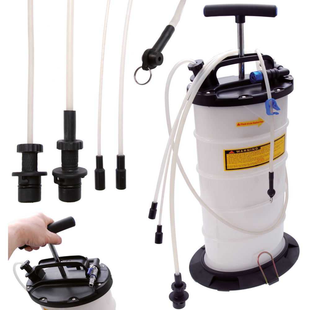 ermöglicht einen sauberen Ölwechsel durch Absaugen - geeignet für Motor-, Getriebe- und Hinterachsöle und für andere, nicht-korrosive Flüssigkeiten - Saugschlauch-Durchmesser in 9,8 - 8,0 - 6,7 - 4,5 mm zum Absaugen durch das Ölmessstab-Rohr - 7,5 L Behälter, mit Fuss für festen Stand, zur Aufnahme großer Öl-Mengen - geeignet zum Ölabsaugen bei z.B. Smart aber auch für alle anderen Fahrzeuge bei denen ein Ölwechsel ohne Nutzung einer Hebebühne durchgeführt werden soll - mit speziellem Silikon-Bremsenentlüftungs-Schlauch mit Ventil zur Einhand-Bedienung - erleichtert das Entlüften von Bremsanlagen an allen Fahrzeugen - die eingebaute Handunterdruck-Pumpe ermöglicht eine Bremsenentlüftung auch ohne Druckluftanschluss.