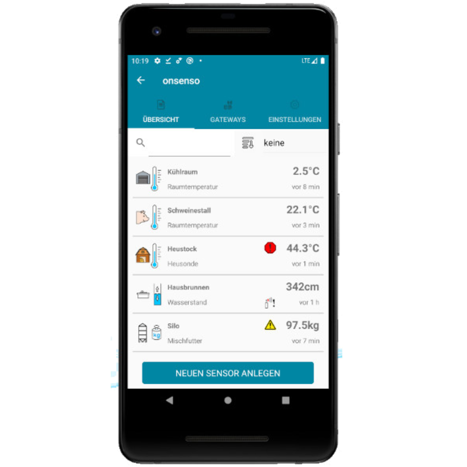 Set zur Online Wasserstandsmessung in Brunnen, Zisternen usw.Laufender Überblick über die eigene WasserversorgungBrunnenfüllstand jederzeit in der Handy App ablesbarAlarmierung bei Unterschreitung des eingestellten MindestwasserstandesProduktbeschreibung:Zuverlässige und bequeme Überwachung Ihres HausbrunnensEin eigener Brunnen sichert eine günstige und unabhängige Wasserversorgung, die Kapazität ist aber nicht unbegrenzt.Mit dem Überwachungssystem von onsenso wird der Pegelstand laufend gemessen und gespeichert.Sie können jederzeit Ihre Wasserversorgung kontrollieren.Frühzeitige Erkennung von WassermangelÜber die stufenweise Alarmierung erfolgt die erste Warnung bereits beim Absinken des Pegelstandes unter den ersten eingestellten kritischen Wert.So können Sie rechtzeitig auf einen drohenden Wassermangel reagieren.Sicheres DatenmanagementDie Datenübertragung erfolgt in verschlüsselter Form ausschließlich über Ihren eigenen onsenso Gateway direkt zum onsenso Server.Nur Sie (und von Ihnen ermächtigte Personen) können mit Ihren Zugangsdaten Ihre Messergebnisse sehen und auswerten.Basis für das Onsenso FernüberwachungssystemMit diesem Set haben Sie alle Komponenten für den Einstieg in die Onsenso Fernüberwachung, auch den Gateway und die erste Jahreslizenz.Sie können jederzeit weitere Sensoren oder Messgeräte ergänzen und Ihr System erweitern.Lieferumfang:• 1 Füllstandssensor inkl. Batterie• 1 Gateway inkl. Netzteil und Netzwerkkabel• 1 Jahreslizenz für bis zu 3 Sensoren• AnleitungSensor:• ABS Kunststoffgehäuse• Schutzklasse Gehäuse IP67• Gehäusemaße 75 x 75 x 35 mm (L x B x H)• Sensor Messbereich 28 bis 750 cm• Abstandsmessung mit Infrarot-Technik• Schutzklasse Sensor IP67• Kabellänge 0,3 m• Sensormaße 31 x 66 mm (Durchmesser x Länge)• Montagedurchmesser 22 mm• Einsatztemperatur -15 bis +60 °C• Datenübertragung über LoRa Funktechnik• Funkfrequenz 868 MHz• AES-128 Verschlüsselung• Messintervall / Sendeintervall 60 Minuten• Reichweite bis 1.000 m• Stromversorgung über Lithium-Batterie 1 x LS14500 3,6 V• Batterielebensdauer ca. 2 JahreGateway:• ABS Kunststoffgehäuse• Gehäusemaße 101 x 74 x 43 mm (L x B x H)• LAN Anschluss mit Netzwerkkabel• Datenübertragung vom Sensor über LoRa Funktechnik• Funkfrequenz 868 MHz• AES-128 Verschlüsselung• Sendeintervall an den Server 10 Minuten, kritische Werte sofort• Spannungsversorgung über 230 V NetzteilOnsenso Server:• Speicherung der Messwerte• Zugriff auf Echtdaten nur für Kunden• Serverstandort ÖsterreichOnsenso Webportal:• Benutzerverwaltung• Anlegen der Gateways und Sensoren• Visualisierung der Messwerte• Festlegen der AlarmierungenOnsenso Handy App:• Anlegen der Gateways und Sensoren• Visualisierung der Messwerte• Festlegen der Alarmierungen• Alarmierung über Push NachrichtenVoraussetzung:stationäres oder mobiles Internetmodem vom Handybetreiber mit Netzwerkabelanschluss für den GatewayACHTUNG: Für den Betrieb ist eine Lizenz erforderlich. Im Kaufpreis ist eine 3-Jahres-Lizenz inkludiert. (Danach fallen weitere Kosten an!)