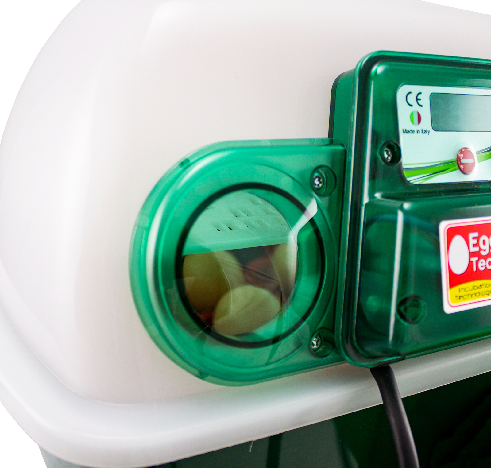 - Bullauge zur Inspektion: Der Deckel ist mit zwei Inspektionsöffnungen ausgestattet, die es dem Benutzer ermöglichen, alle Phasen der Brutzeit von außen zu verfolgen