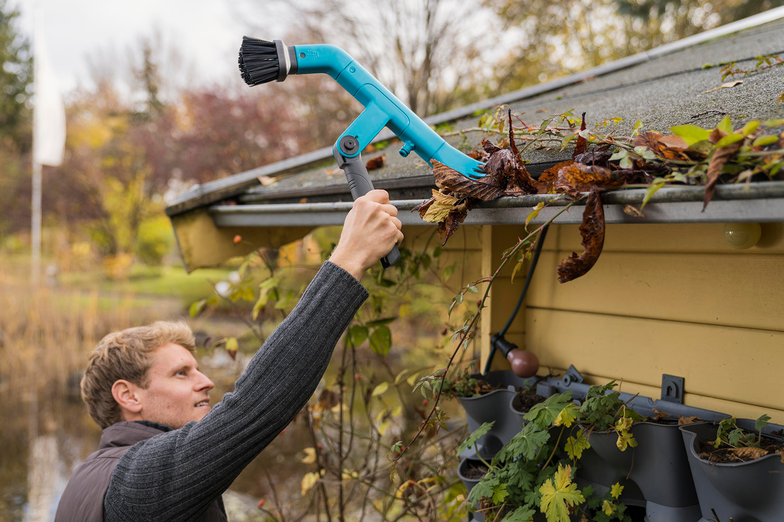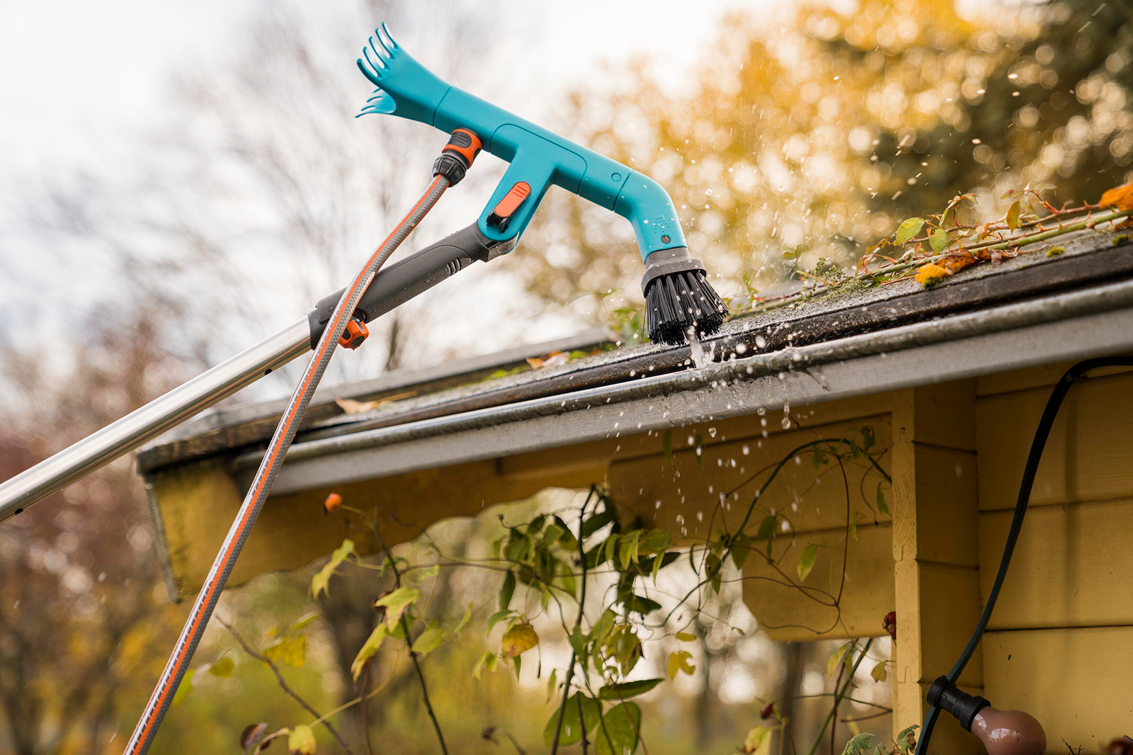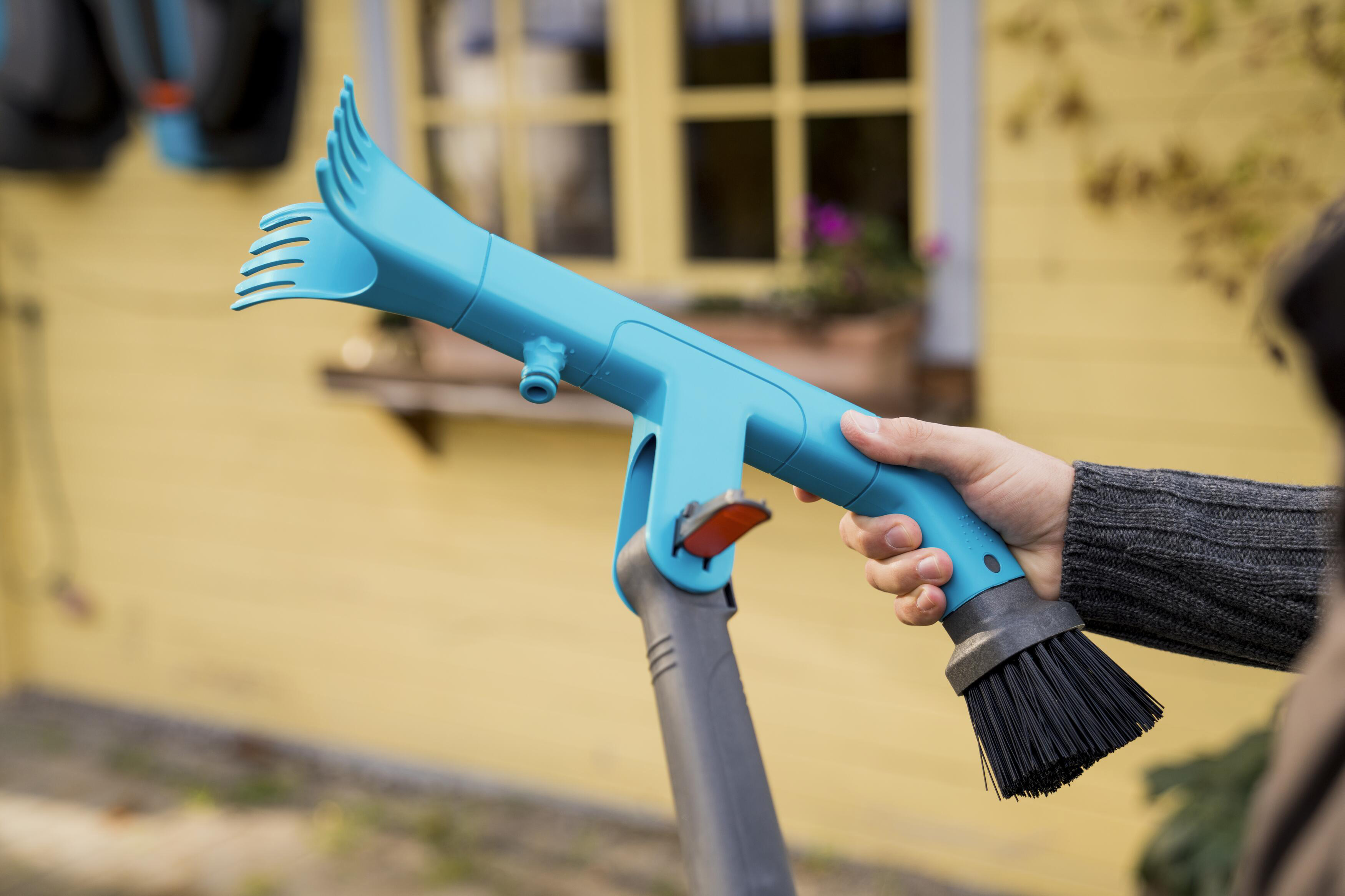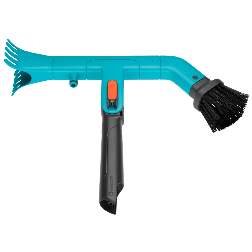 Einfaches Säubern und Ausräumen von Dachrinnen. Arbeiten bis ca.5 Meter Höhe möglich.Mit dem GARDENA combisystem-Dachrinnenreiniger kannst Du optimal und einfach Dachrinnen säubern und ausräumen.Ideal als Verlängerung, für den Einsatz in bis zu fünf Metern Höhe, passt dazu der Stiel (Faie Nr. 121461), derNICHT IM LIEFERUMFANG ENTHALTEN IST !!!Die stabilen Borsten auf der einen Seite sowie zwei robuste Schaber aus hochwertigem Kunststoff auf der anderen Seite sorgen dafür, dass Du effektiv arbeiten kannst.Die Reinigung der Dachrinne mit Wasser ist ebenfalls möglich: Ein Original GARDENA System Anschluss ist integriert, an den Du einfach den Gartenschlauch anschließen kannst.Um die Dachrinne bequem zu erreichen, kannst Du den Arbeitswinkel mit dem Schnellverschluss individuell anpassen.
