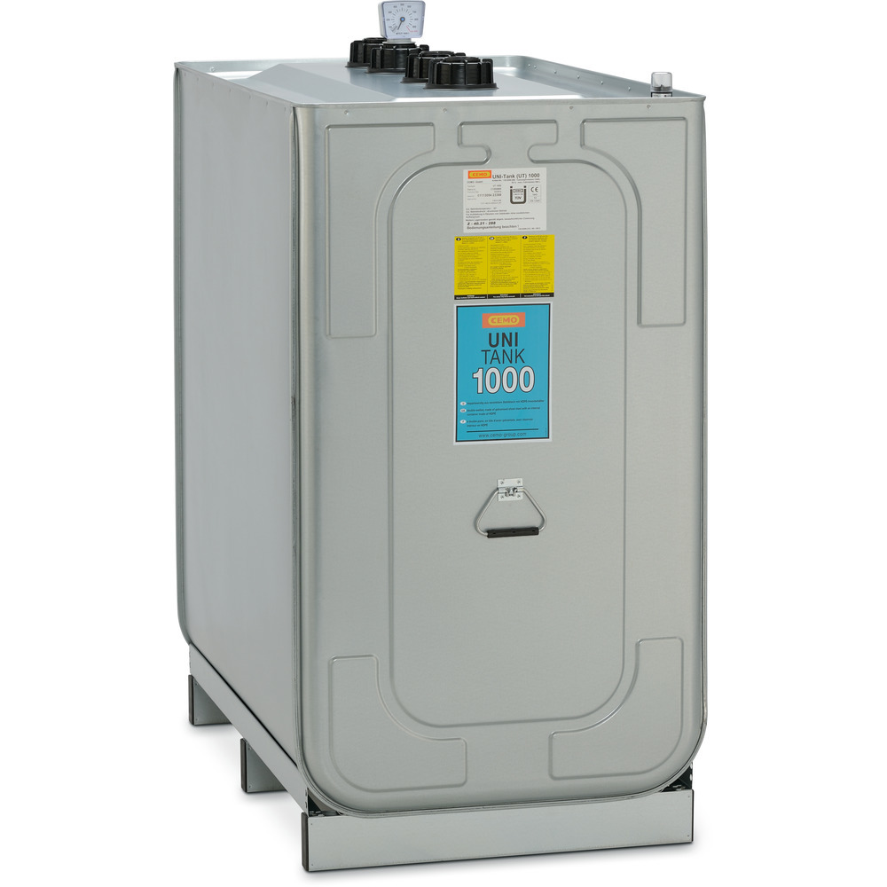 Inhalt 998 L. Komplett mit Füllstandsanzeige, optische Leckanzeige, Tragegriffe sowie verzinktem Untergestell.Maße: 128x76x142 cm.
