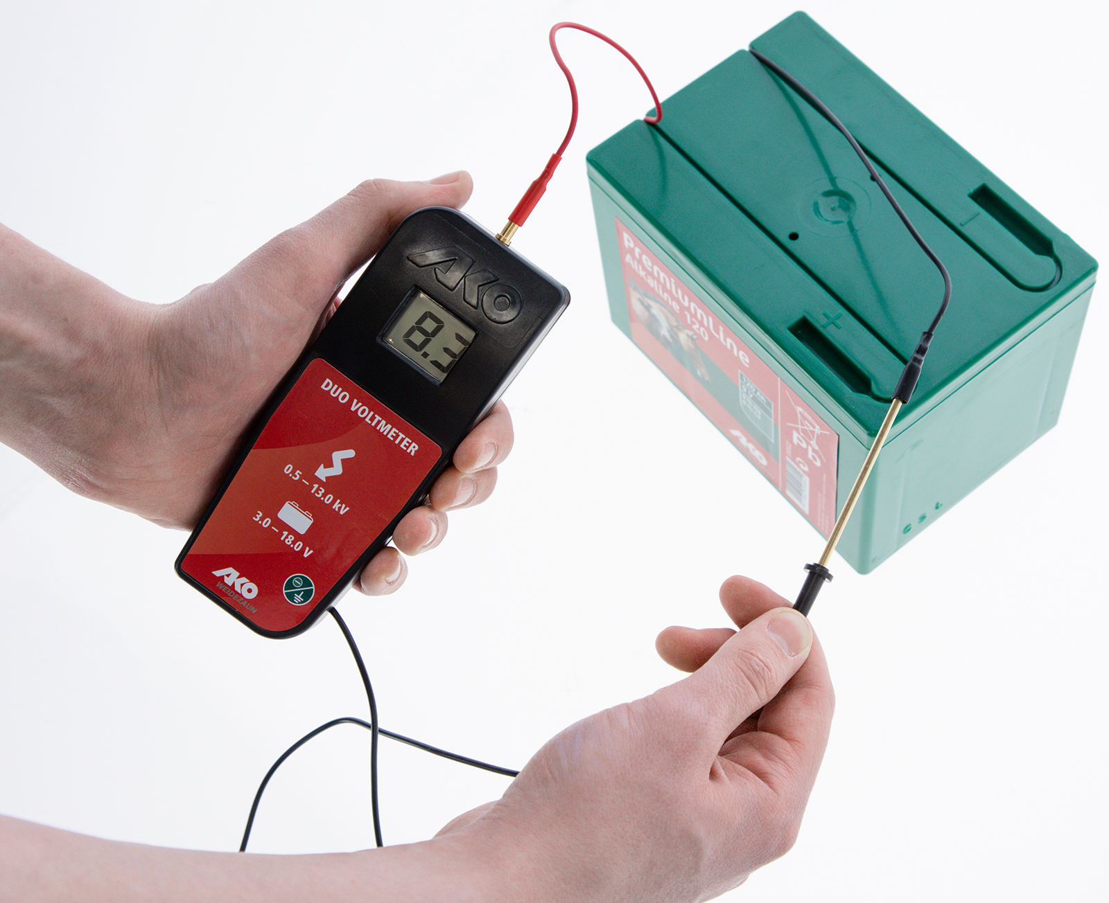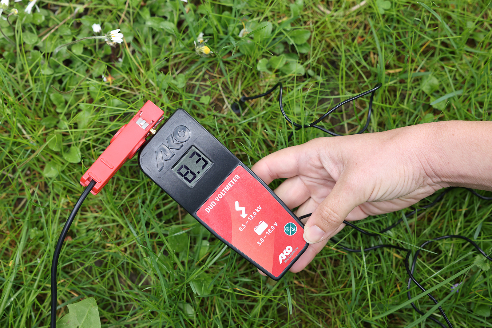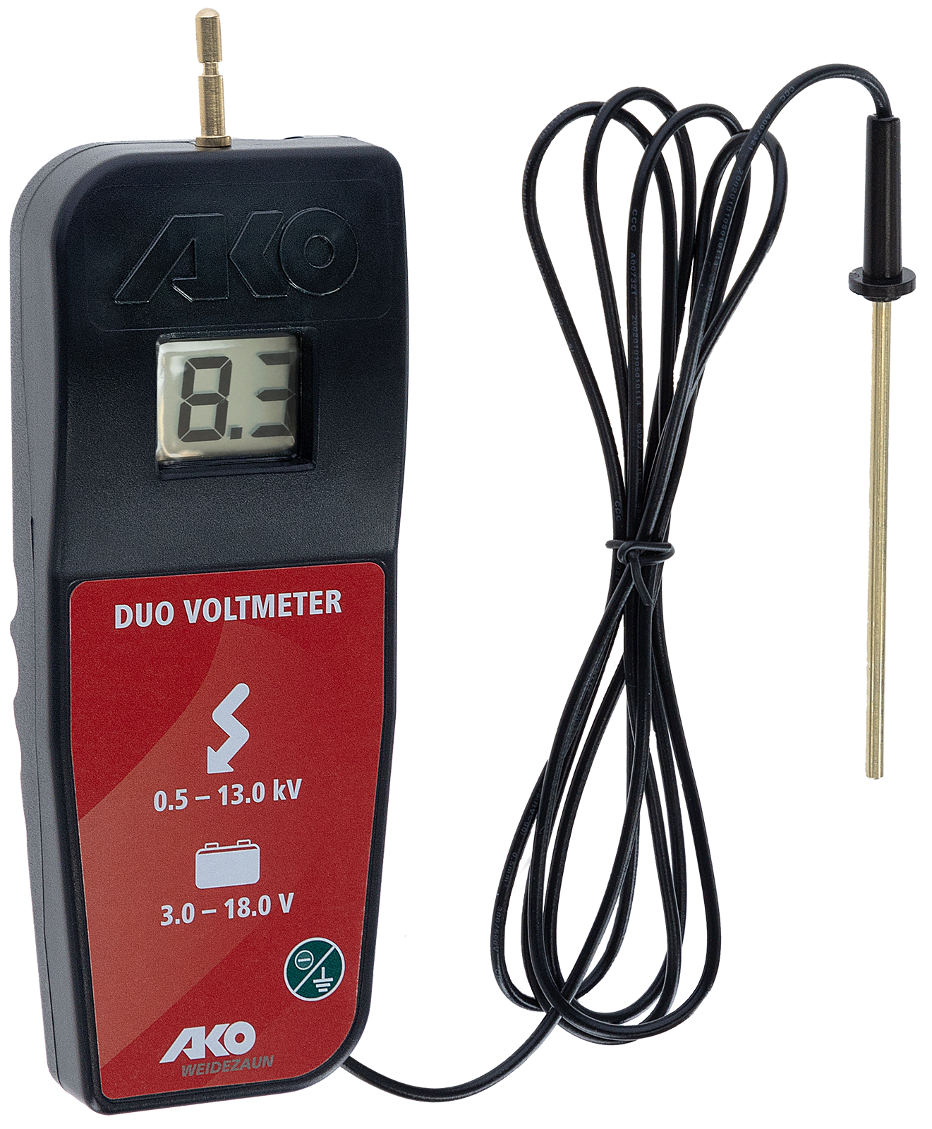 - misst die Hochspannung am Gerät oder Zaun in Kilovolt (0,5 - 13,0 -> 500 - 13.000 V) und die Batterie/Akkuspannung in Volt (von 3 - 18 V). Werte darüber werden durch Hi angezeigt.