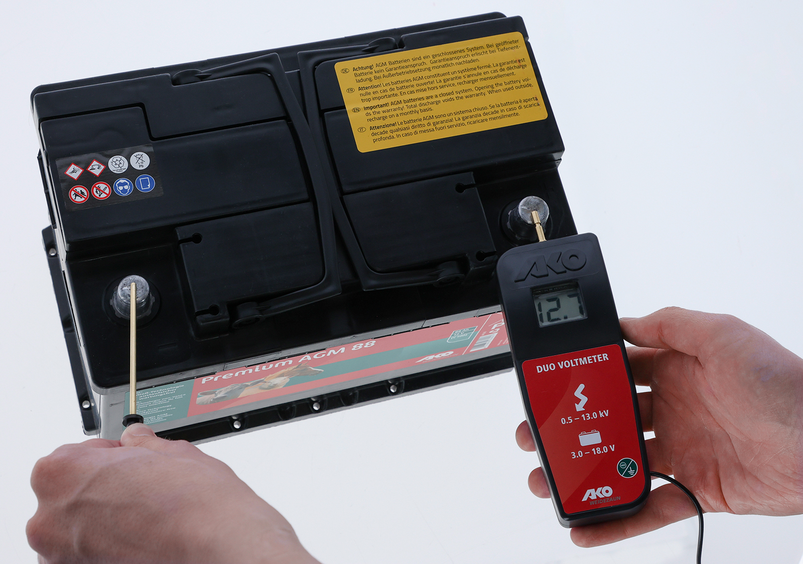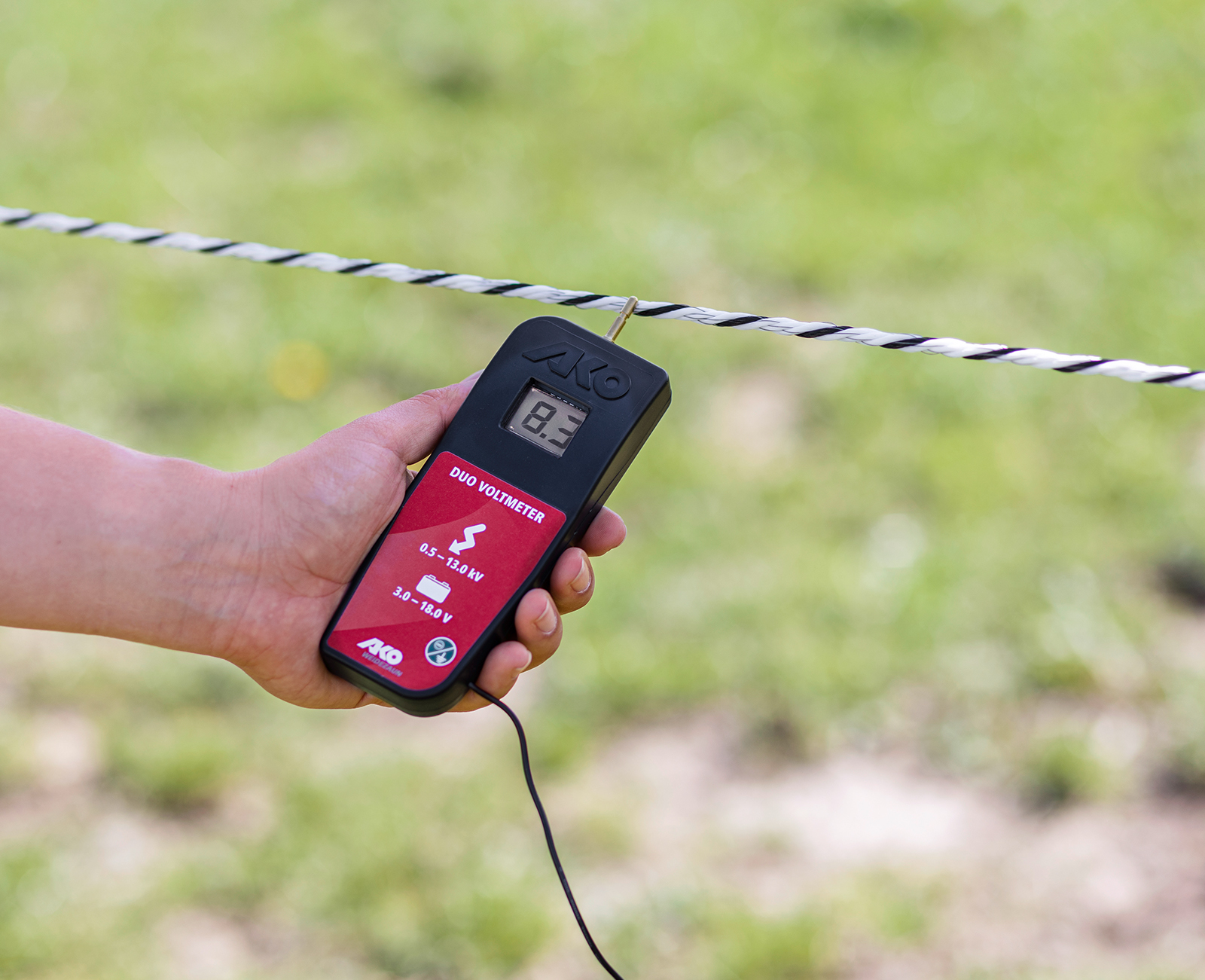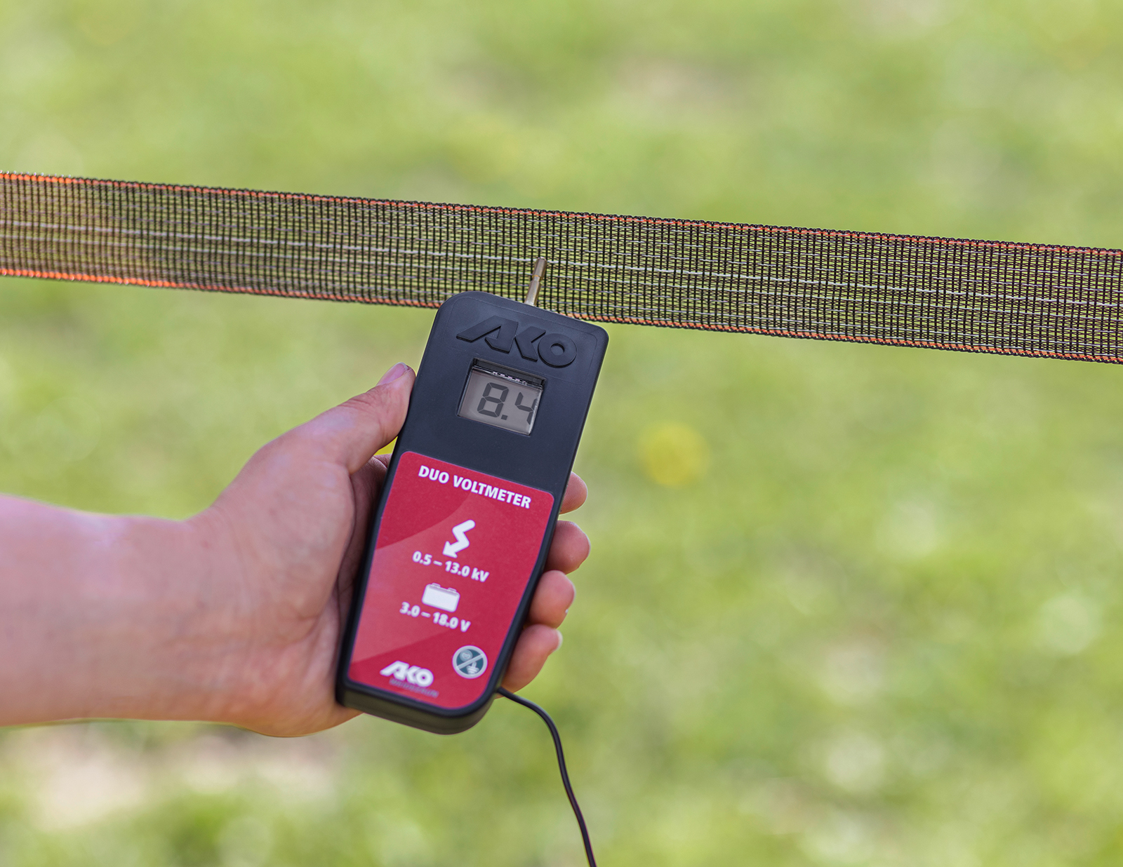 - misst die Hochspannung am Gerät oder Zaun in Kilovolt (0,5 - 13,0 -> 500 - 13.000 V) und die Batterie/Akkuspannung in Volt (von 3 - 18 V). Werte darüber werden durch Hi angezeigt.