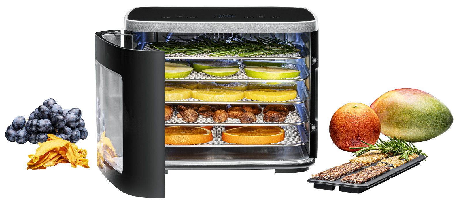 Mit rund 0,2 m² Dörrfläche und 5 Edelstahltabletts ist er ideal für kleine Haushalte oder für den Einstieg ins Food-Prep.