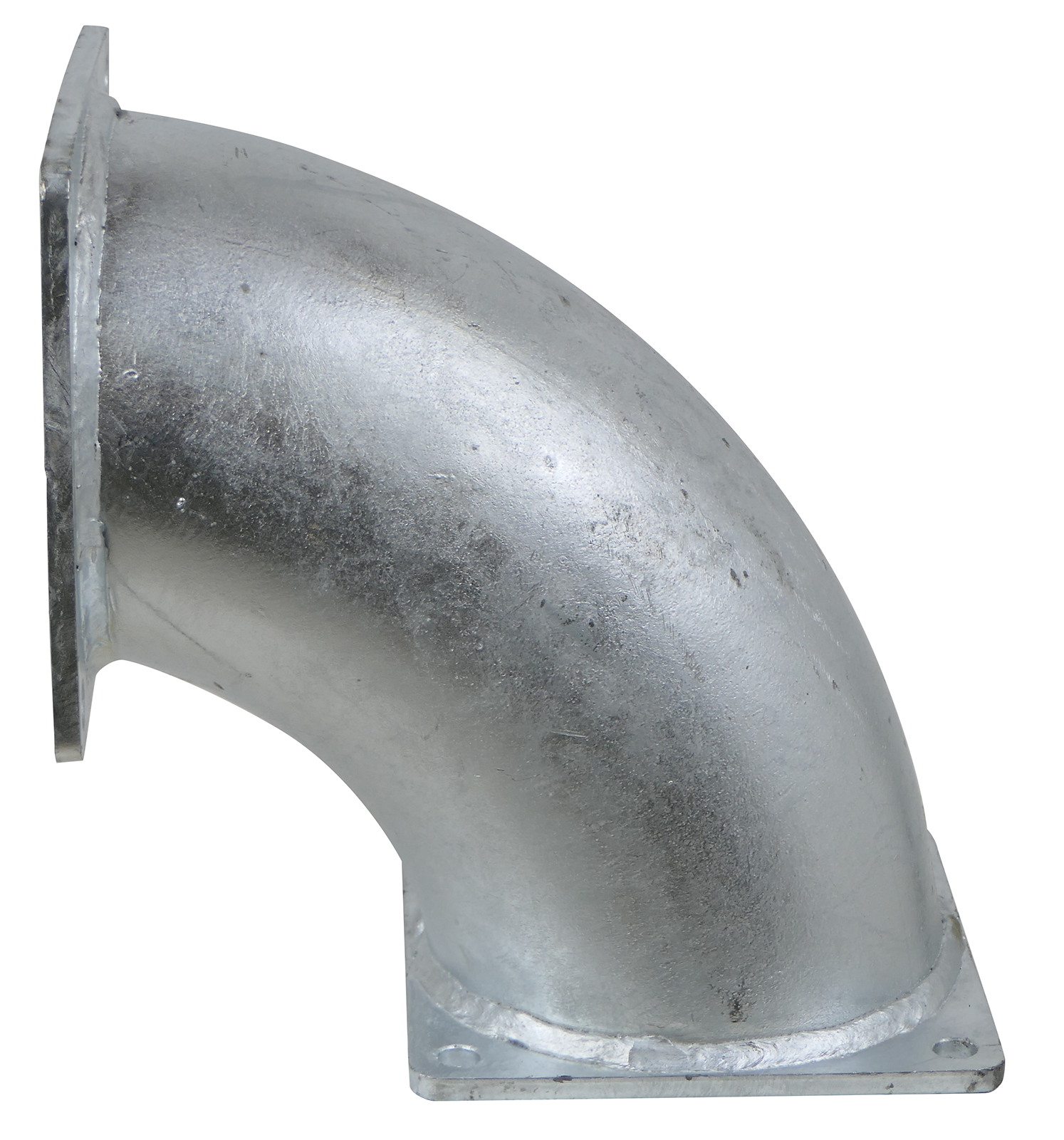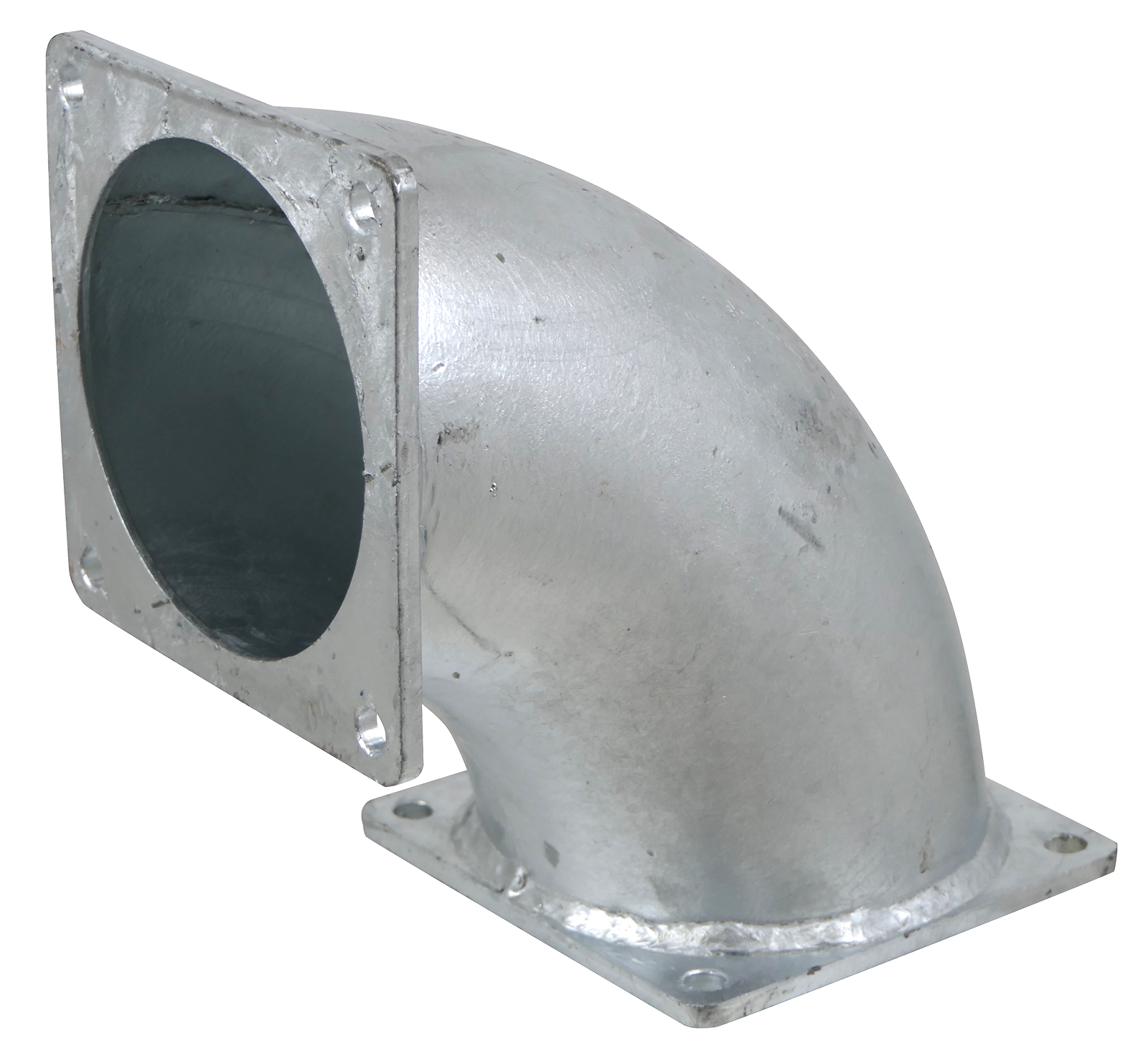 Rohrbogen 90° in der Größe 6 mit zwei Flanschanschlüssen. Der quadratische 4-Lochflansch hat die Abmessung 180x180mm. Der Lochabstand der Bohrungen beträgt 150x150mm und die Bohrungen haben einen Durchmesser von 13mm. Der Doppelflanschbogen hat einen Radius von 195mm und eine Höhe von 285mm.