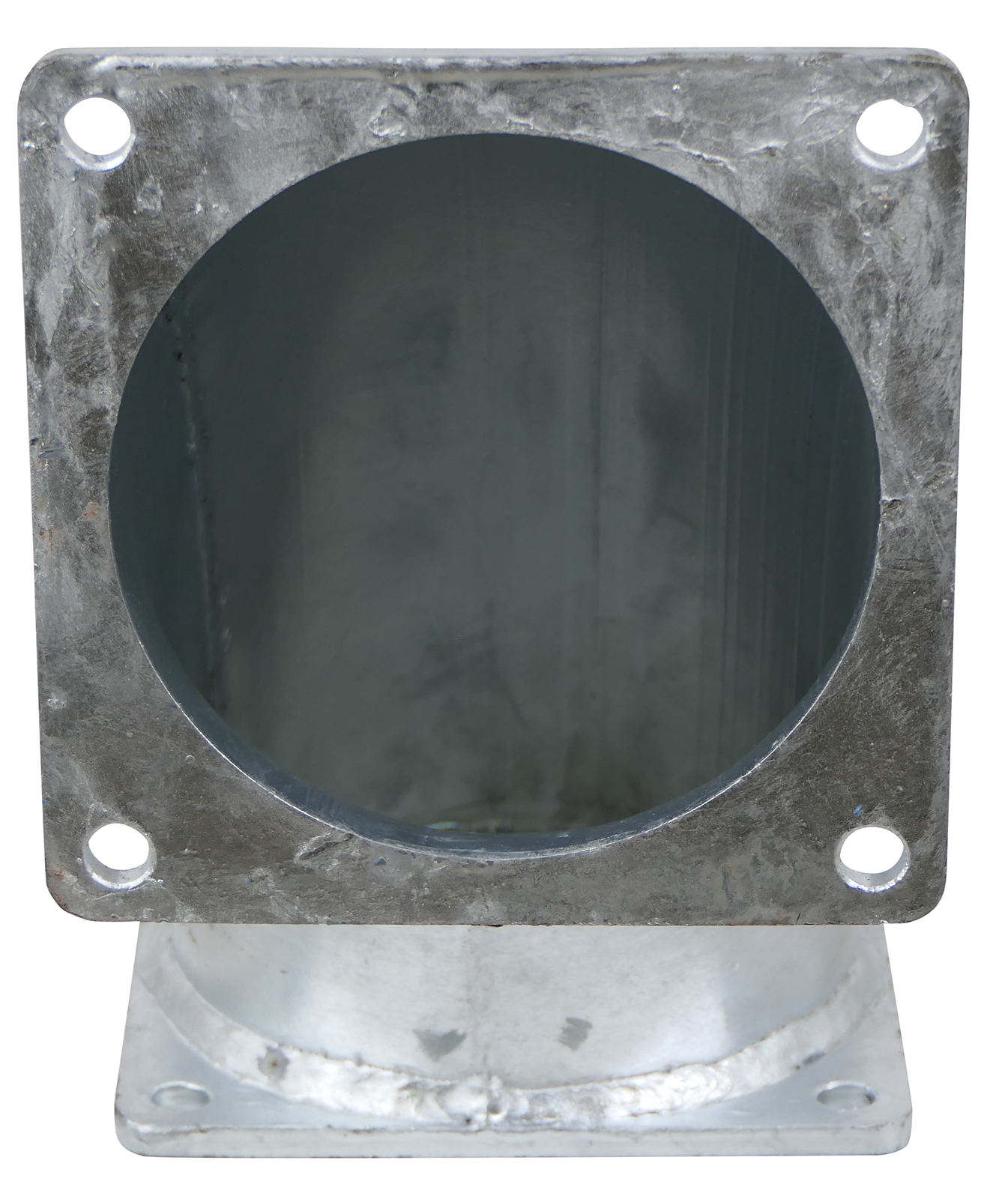 Rohrbogen 90° in der Größe 6 mit zwei Flanschanschlüssen. Der quadratische 4-Lochflansch hat die Abmessung 180x180mm. Der Lochabstand der Bohrungen beträgt 150x150mm und die Bohrungen haben einen Durchmesser von 13mm. Der Doppelflanschbogen hat einen Radius von 400mm und eine Höhe von 490mm.