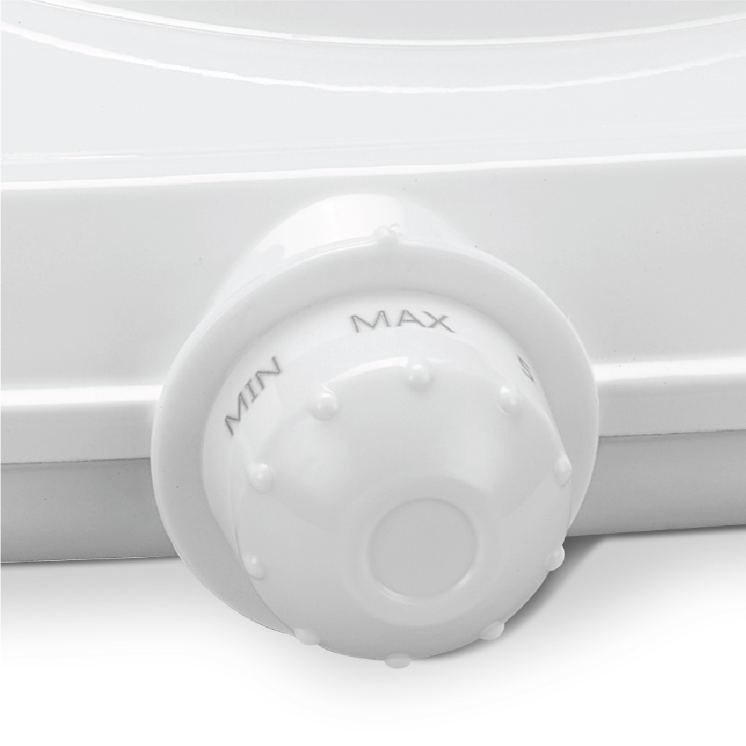 Kochfelder mit Durchmesser 18 cm und 15 cm und einer stufenlosen Temperatureinstellung durch ein Thermostat mit Kontrollleuchte.