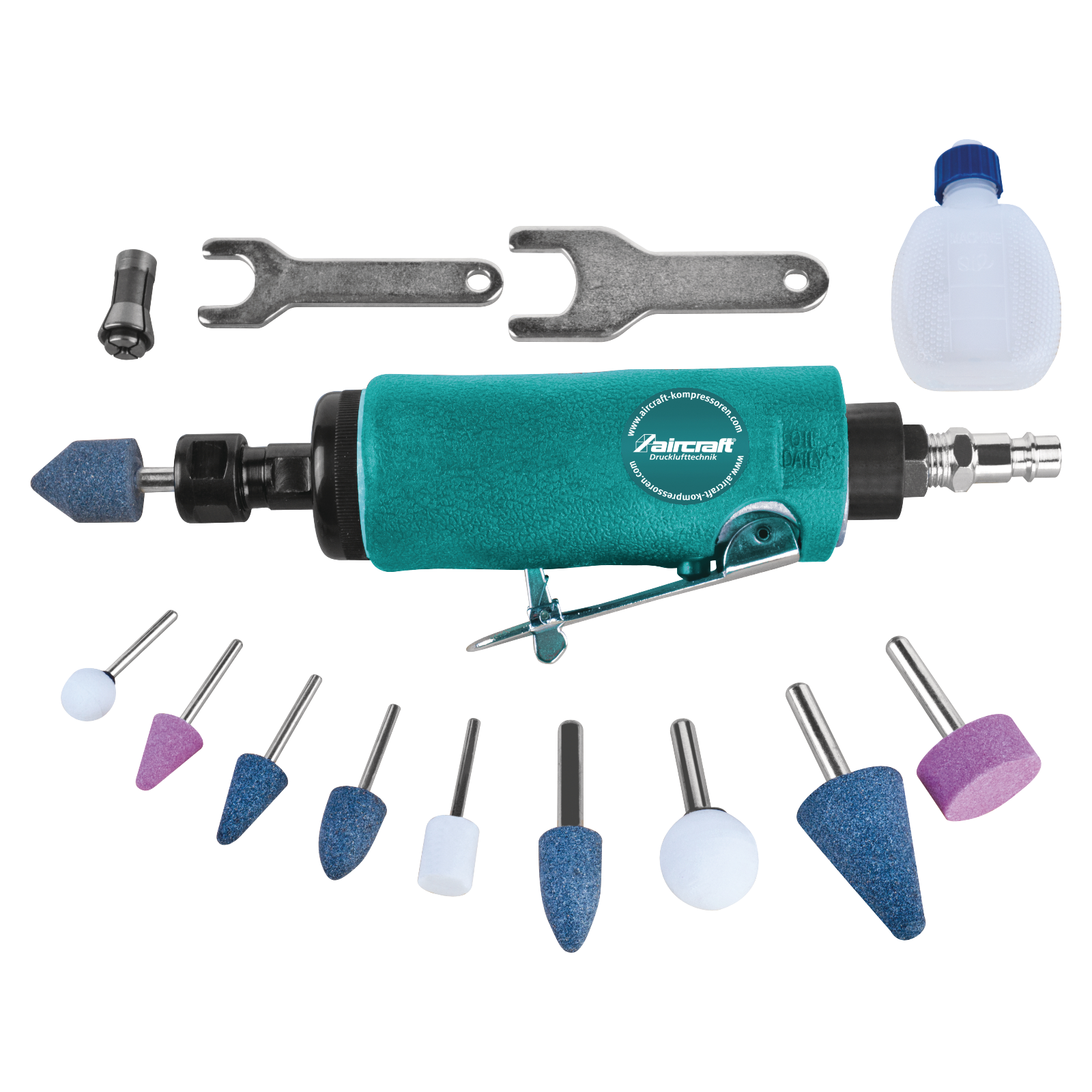 Spannzange Ø6 mm für alle handelsüblichen Schleifstifte und Fräser geeignet. Schaft Ø 3 und 6 mm. Leerlaufdrehzahl 24000 U/min. Gewicht nur 0,4 kg, komplett inkl. 10-tlg. Schleifstift-Sortiment und Koffer.