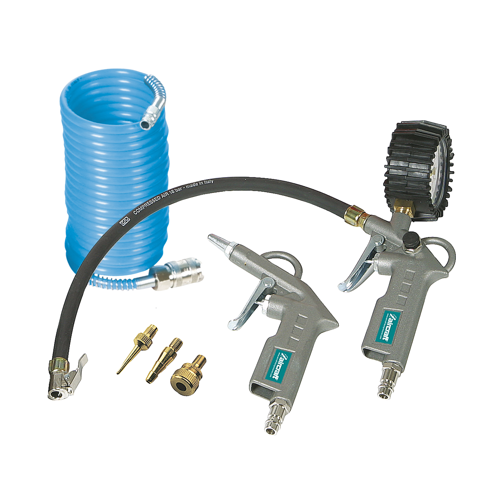 Hochwertiges Einsteigerset mit Blaspistole, Reifenfüller, Adapterset, sowie Spiralschlauch.