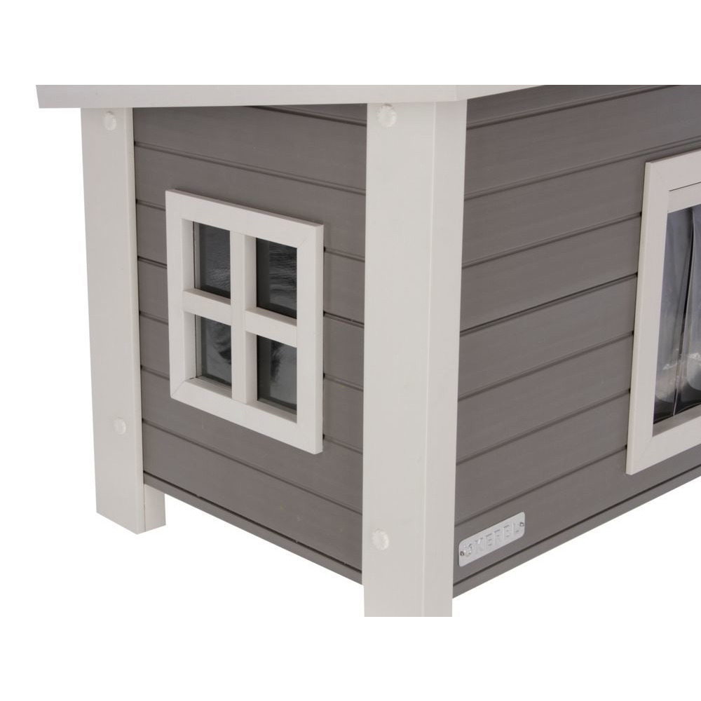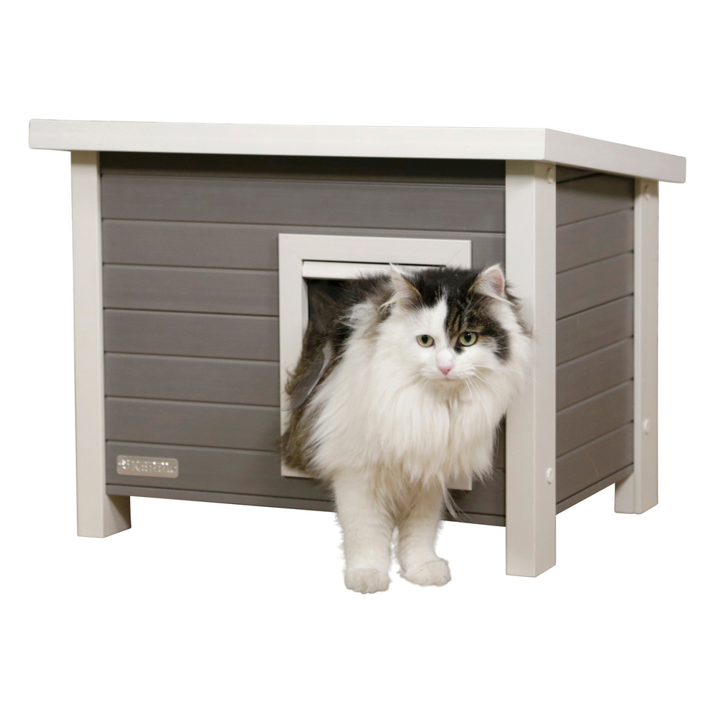 In diesem Häuschen wird sich Ihre Katze richtig wohl fühlen - hierhin kann sie sich jederzeit zurückziehen!Das Dach lässt sich aufklappen und fixieren, die Schwingtüre mit Lamellen schützt vor Wind und Kälte, gleichzeitig lässt das Seitenfenster mehr Licht in den Innenraum. Die Montage ist durch vorgebohrte Löcher und Gewinde sehr einfach. Inkl. Aufbauanleitung, Lieferung erfolgt zerlegt im Karton.Material: aus Eco-Recyclingmaterial (60 % Kunststoff / 40 % Holz), wasserdicht, geruchsneutral, wartungsfrei, mit guter Isolierung, UV- und wetterbeständig (4-Seasons), schwer entflammbar, einfache und schnelle Reinigung möglich, glatte, hautfreundliche und feste Oberflächen, umweltfreundlich in der Herstellung, kein verfaulen möglich.Maße außen (L x B x H): 57 x 45 x 43 cm, Innenmaße: 48 x 35,5 cm, Tür-Ausschnittmaß: 16 x 18 cm
