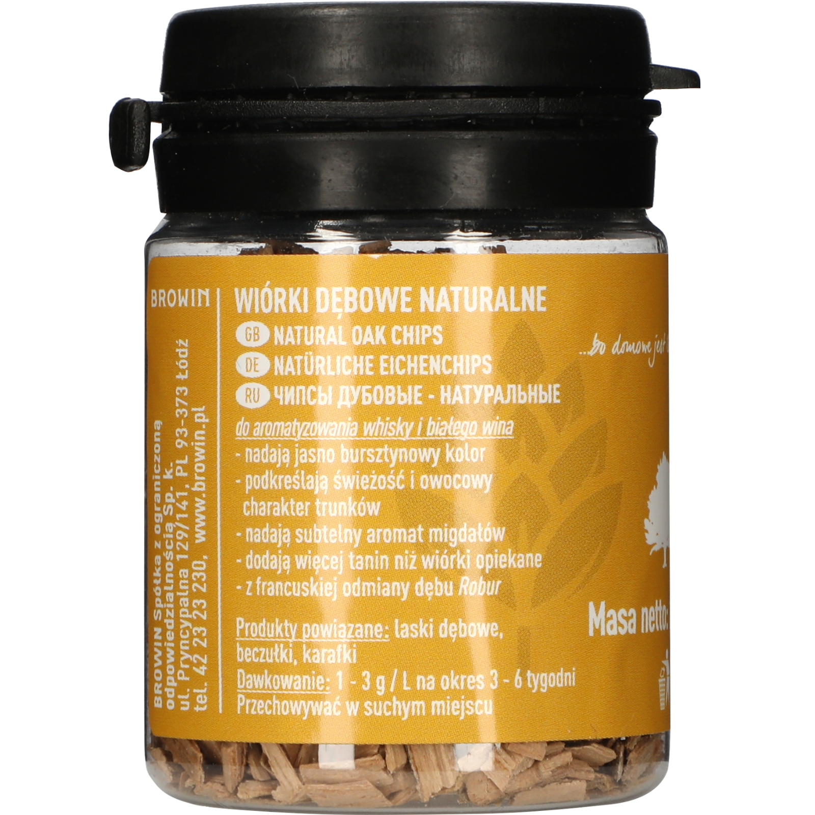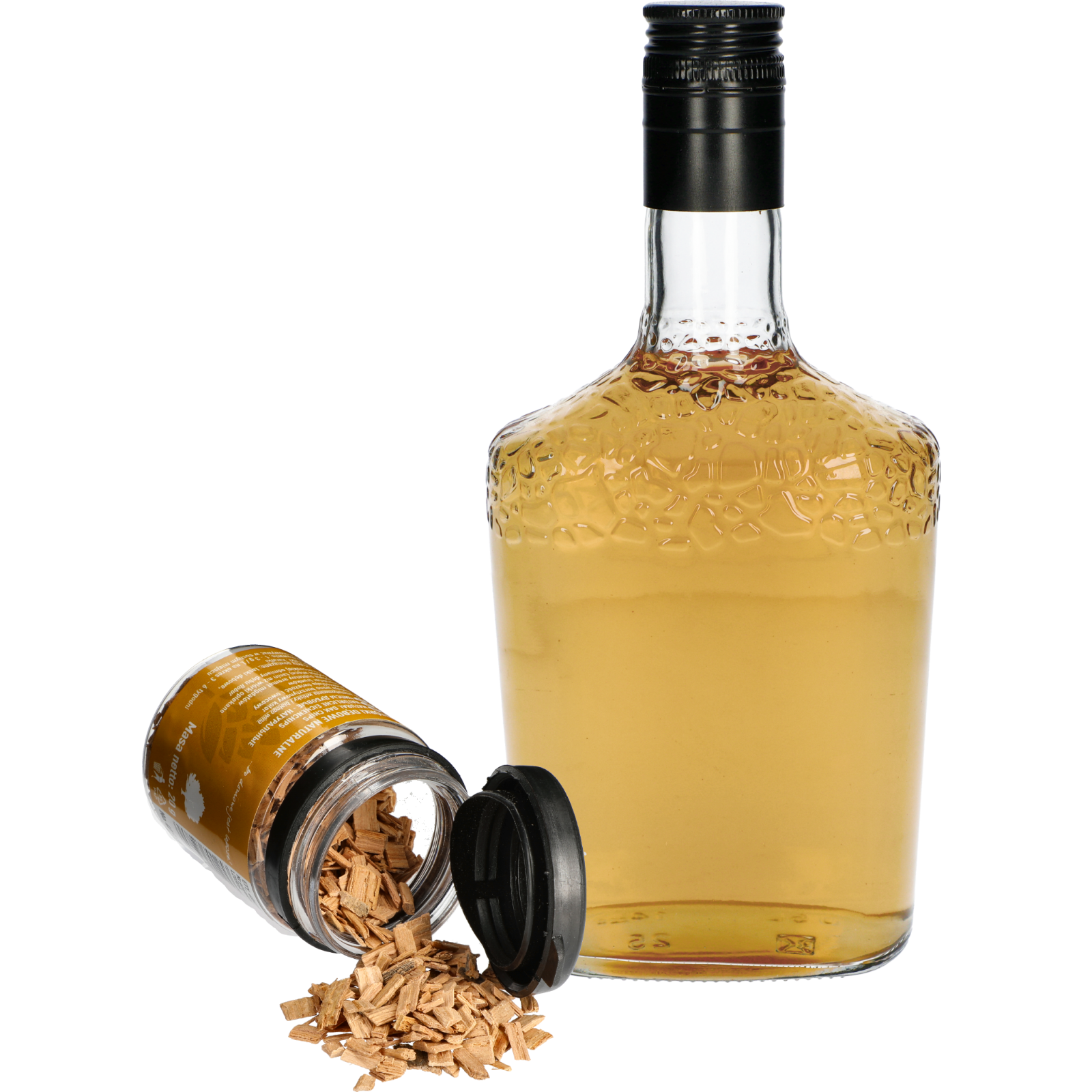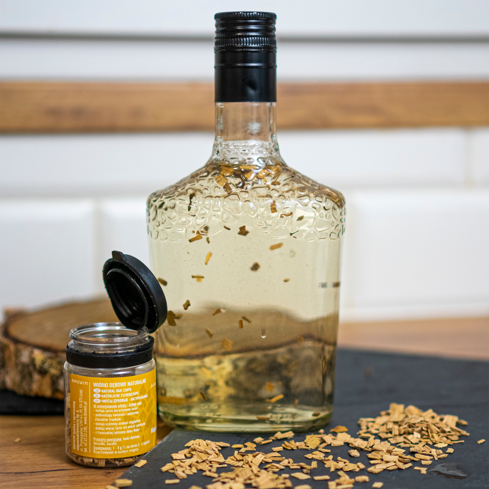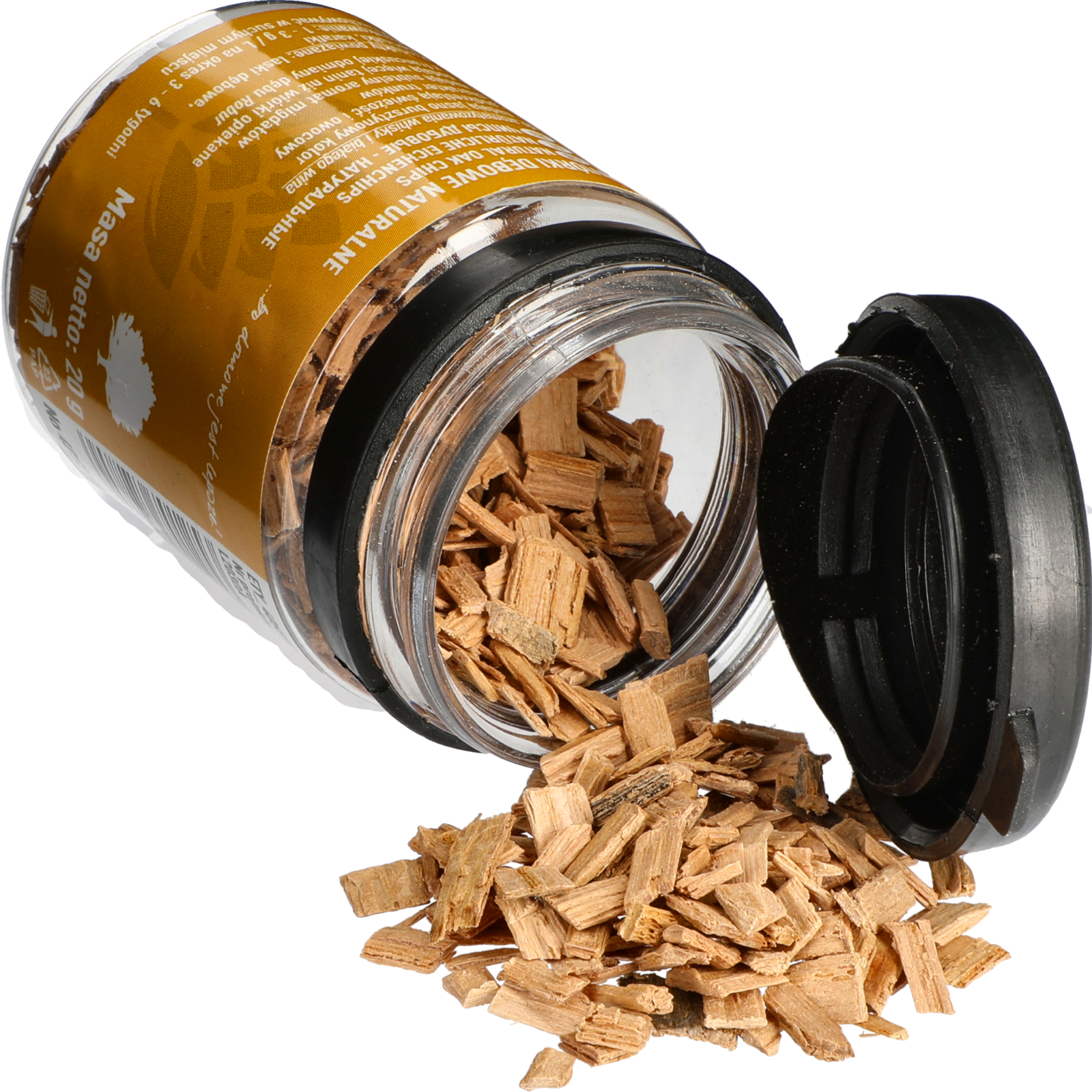 Für Weißweine oder Whiskey - natürliche Eichenspäne bereichern ideal das Aroma von Weißweinen und Destillaten.Es verleiht Aroma und Geschmack - die Zugabe von Eichenspänen bereichert den Alkohol mit wertvollen Tanninen, Eichen - sowie Mandelaromen.Sie verleihen eine helle Farbe von Bernstein.Die Späne werden aus der französischen Eichensorte Robur hergestellt.Die Eichenspäne werden direkt zum Alkohol oder während seiner Gärung oder zum fertigen edlen Tropfen hinzugefügt und für 3-6 Wochen stehengelassen.Eichspäne sind ein idealer Ersatz für teure und schwer handzuhabende Eichenfässer, die für die Reifung vieler Alkohole verwendet werden.Dank Ihnen erlangen Sie in den zubereiteten edlen Tropfen auf einfache Weise die gewünschten Aromen und Eichennoten.In Weinen oder Likören unterstreicht der Zusatz von Eichenspänen die Frische und den fruchtigen Charakter der edlen Tropfen.Die angebotenen Späne werden sich auch für hausgemachte Alkohole vom Typ Cognac, Bourbon, Brandy bewähren.Hauptmerkmale:Rohstoff: Französische Eichensorte RoburArt: ungeröstetAroma: MandelDosierung: 1-3 g/ 1 LNettogewicht: 20 gVerwendungsweise:Die genaue Dauer des Kontakts der Späne mit dem Alkohol sollte individuell auf der Grundlage von Verkostung angepasst werden.Wenn Sie den Grad der Konzentration von Aroma im edlen Tropfen als passend befinden, entfernen Sie die Späne und erfreuen Sie sich an seinem Geschmack.