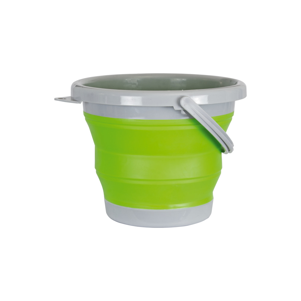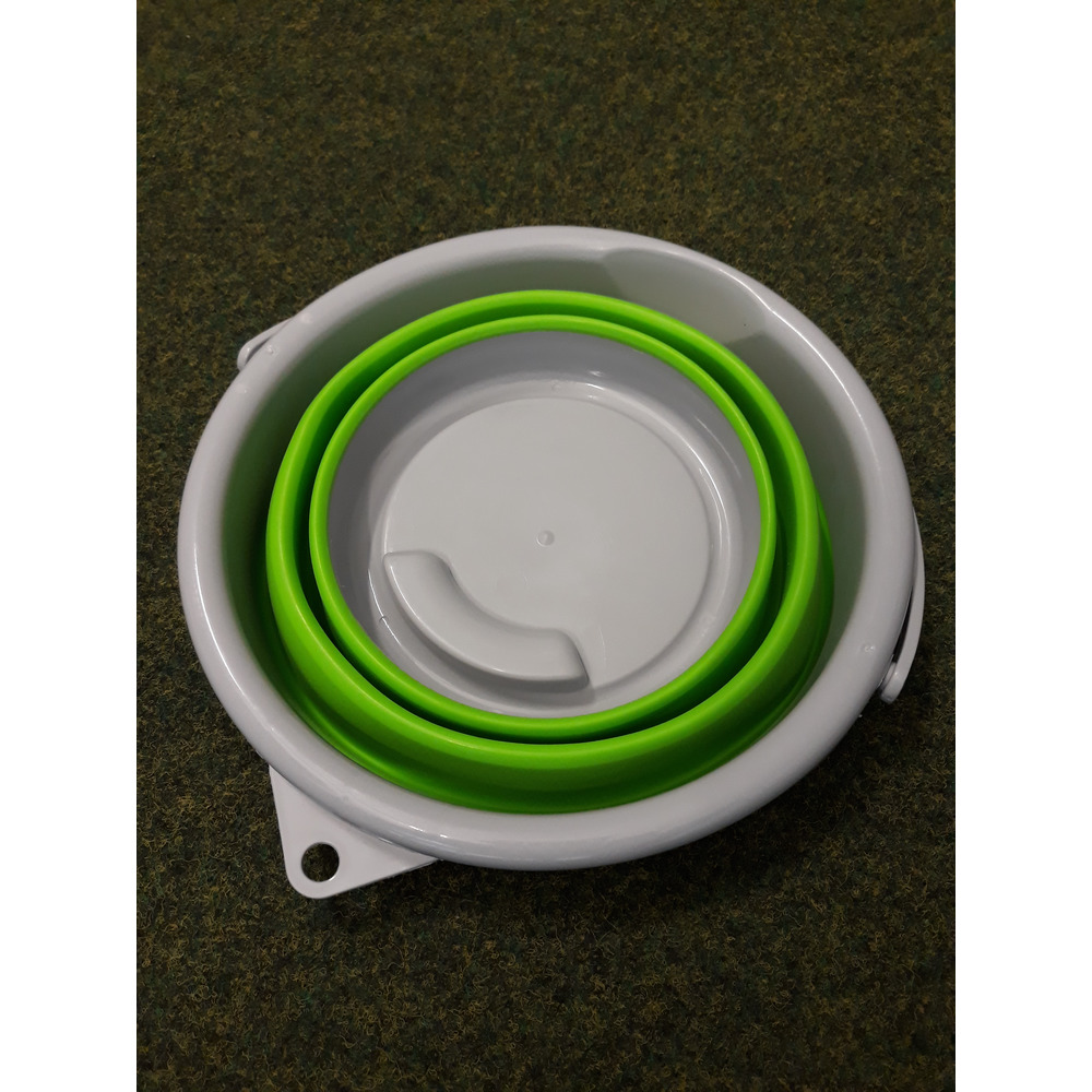 Faltbarer Eimer in grün, superflach faltbar auf ca. 5 cm Höhe. Bei Nichtgebrauch lässt sich der Eimer ganz einfach zusammenklappen. Material: Kunststoff /Gummi, Maße: oben Ø 25 cm, unten Ø 15,5 cm, Höhe 20 cm. Fassungsvermögen: ca. 5 L.