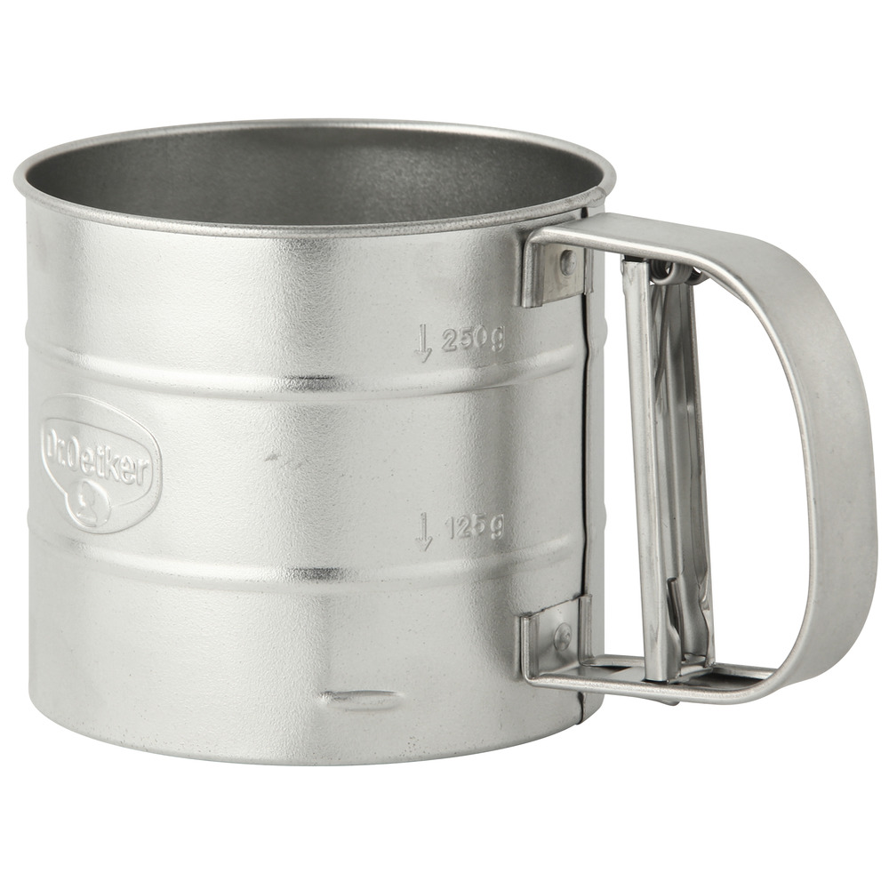 Einhandmehlsieb aus Metall, zum Aufbewahren von Mehl oder Puderzucker, zum gleichmäßigen Bemehlen und Bestreuen, Füllvolumen 350g, Maße Ø 10,5x9,5cm.