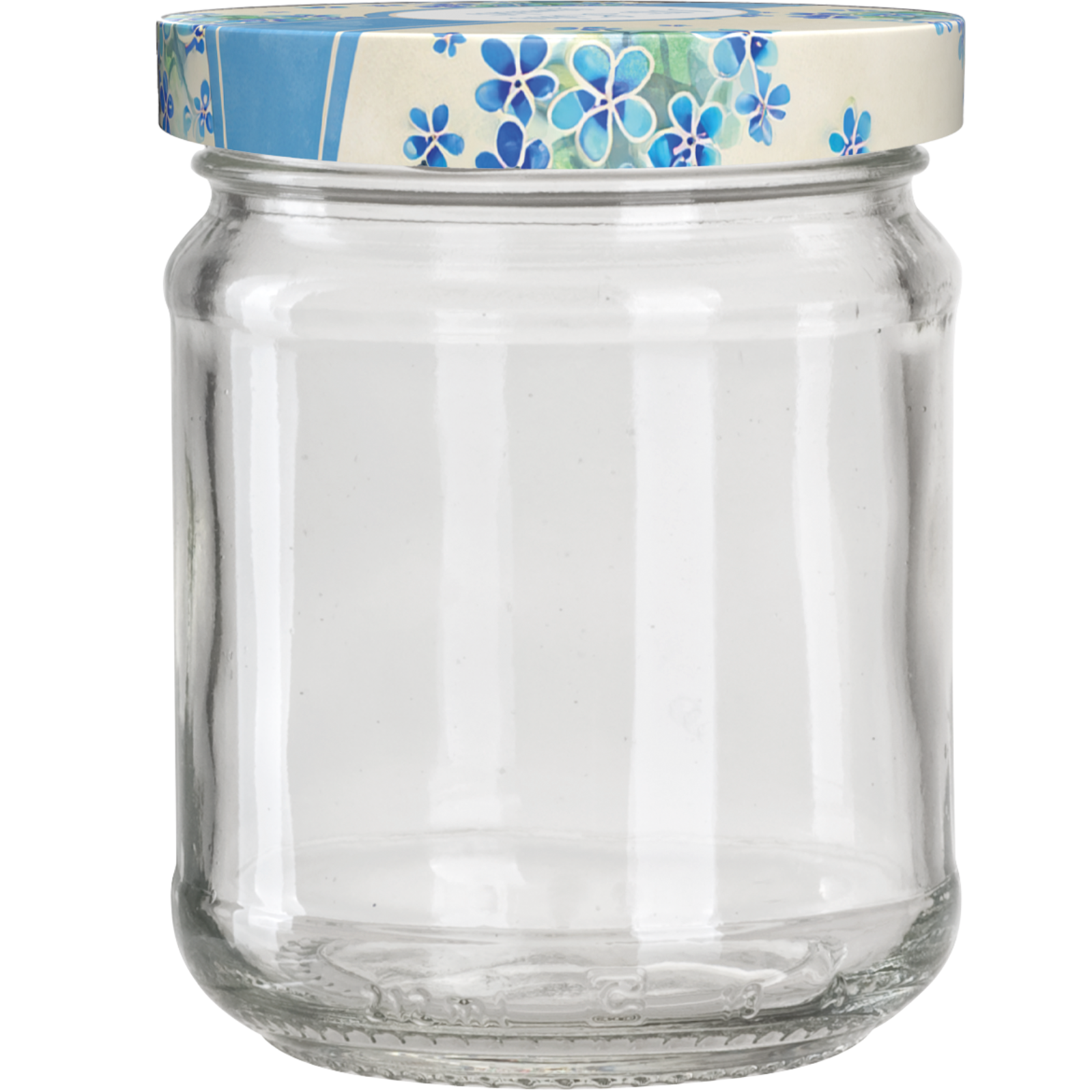 Klassische Einkochgläser mit Schraubdeckel im floralen Design und dem Spruch: 'Mit Liebe gemacht'. Ideal für Marmeladen und Chutneys.