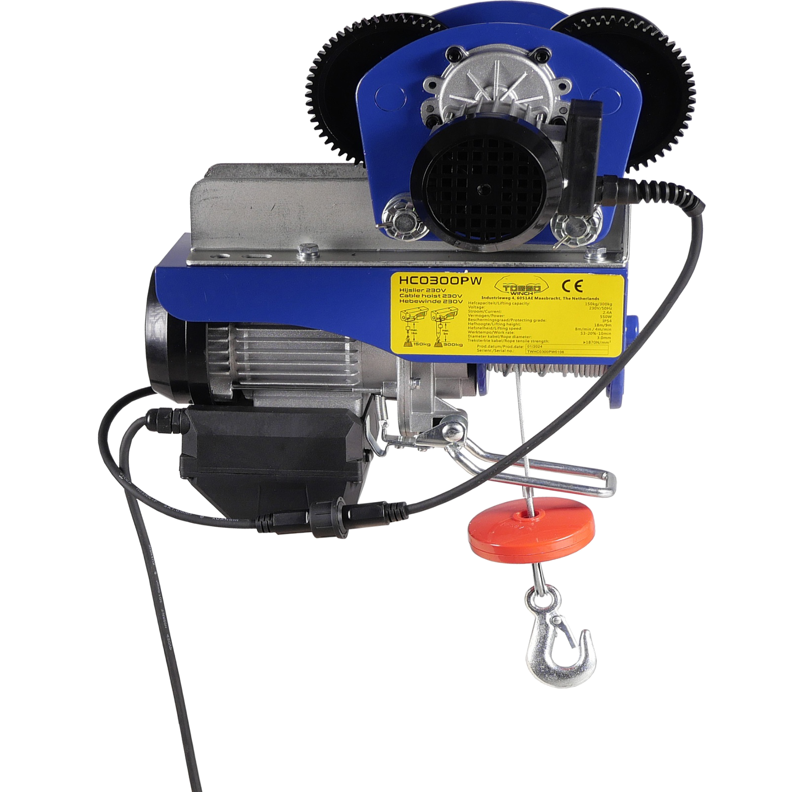 Der Seilzug hat eine maximale Hubkraft von 150 bzw. 300 kg mit Umlenkrolle. Durch das 18 m lange Stahldrahtseil ergibt sich eine große Hubhöhe.