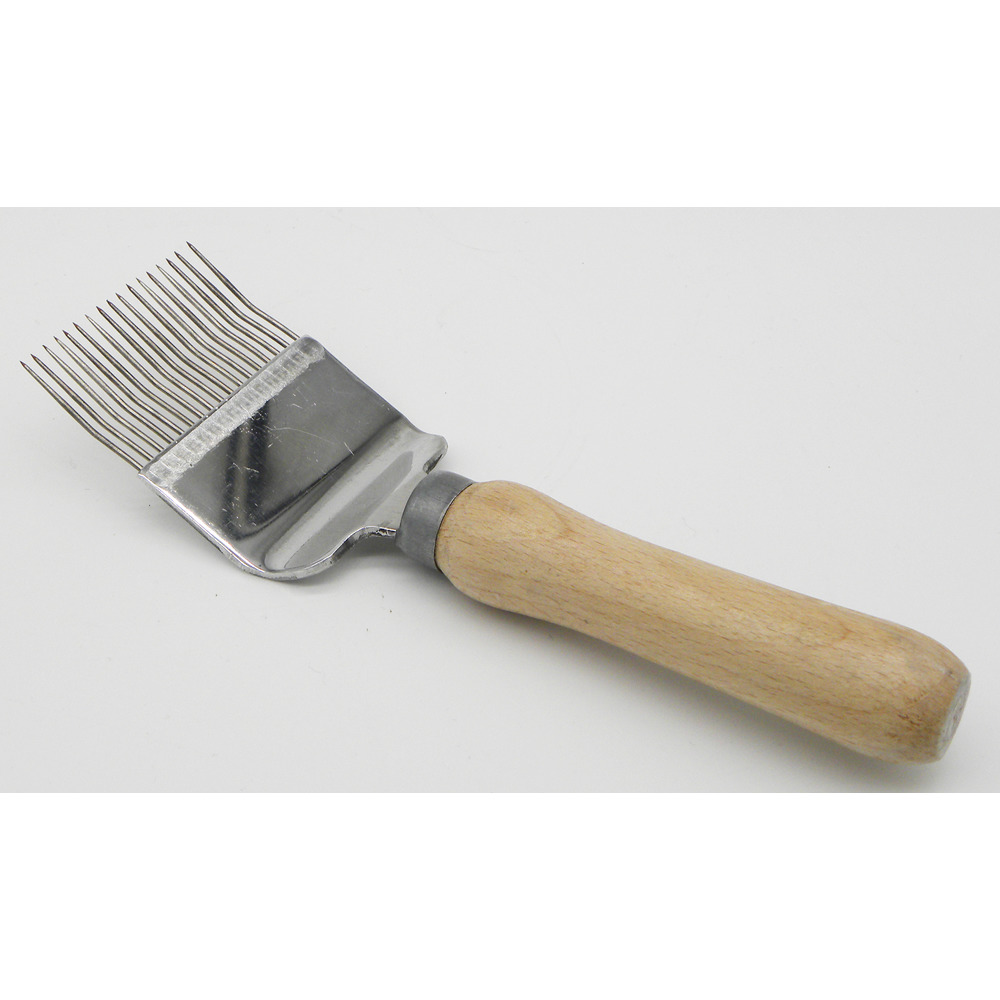 Entdeckelungsgabel mit gebogenen Metallzinken und Holzgriff