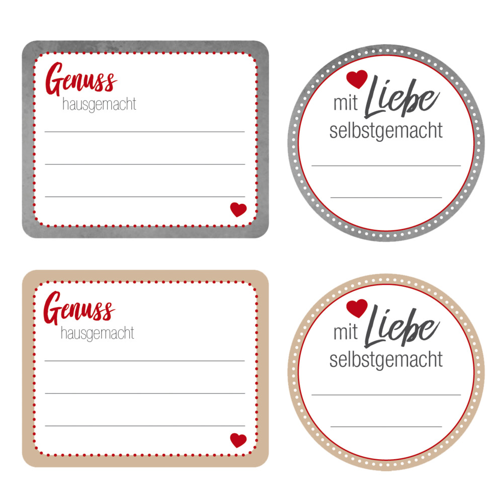 Runde und eckige Etiketten, selbstklebend. 6 Sticker je Blatt. Maße: runder Sticker Ø 4 cm, eckiger Sticker ca. 5 x 4 cm.