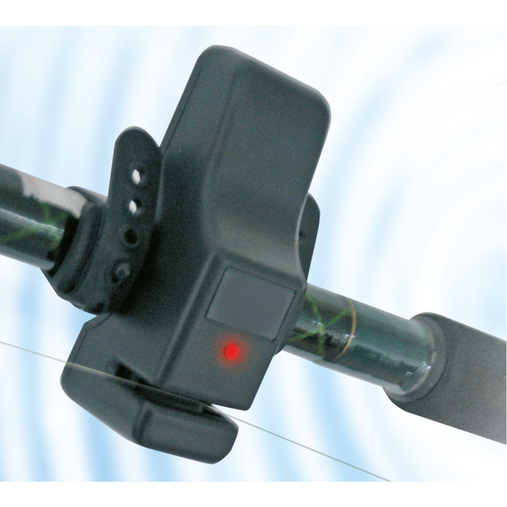 Komplett mit 3 Knopfbatterien. Wird mittels Gummiband auf der Angelrute befestigt, beim Biss wird ein optisches und ein akustisches Signal ausgelöst.