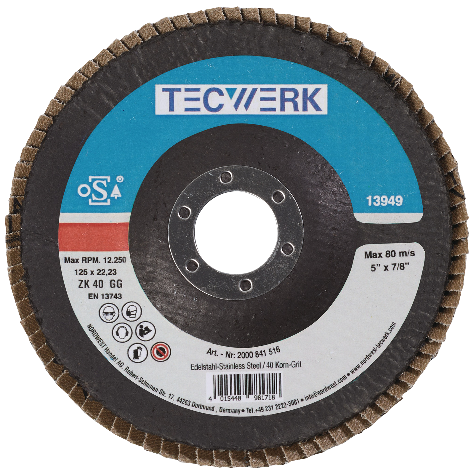Zirkonkorund, Lamellen schräg. Besonders hohe Zerspanungsleistung und extreme Standzeit bei legierten, unlegierten und vergüteten Stählen, hochfesten NE-Metallen, Edelstahl. Auf Glasgewebeteller. Besonders geeignet für Grob- und Zwischenschliff, zur Bearbeitung von Schweißnähten, Entgraten, Flächenglätten, Entrosten und Gussputzen. Ohne Stützteller zu verwenden. Bohrung 22,23 mm Ø. Weitere technische Eigenschaften: Bohrung 22,23 mm, max. Drehzahl 12200 min⁻¹.
