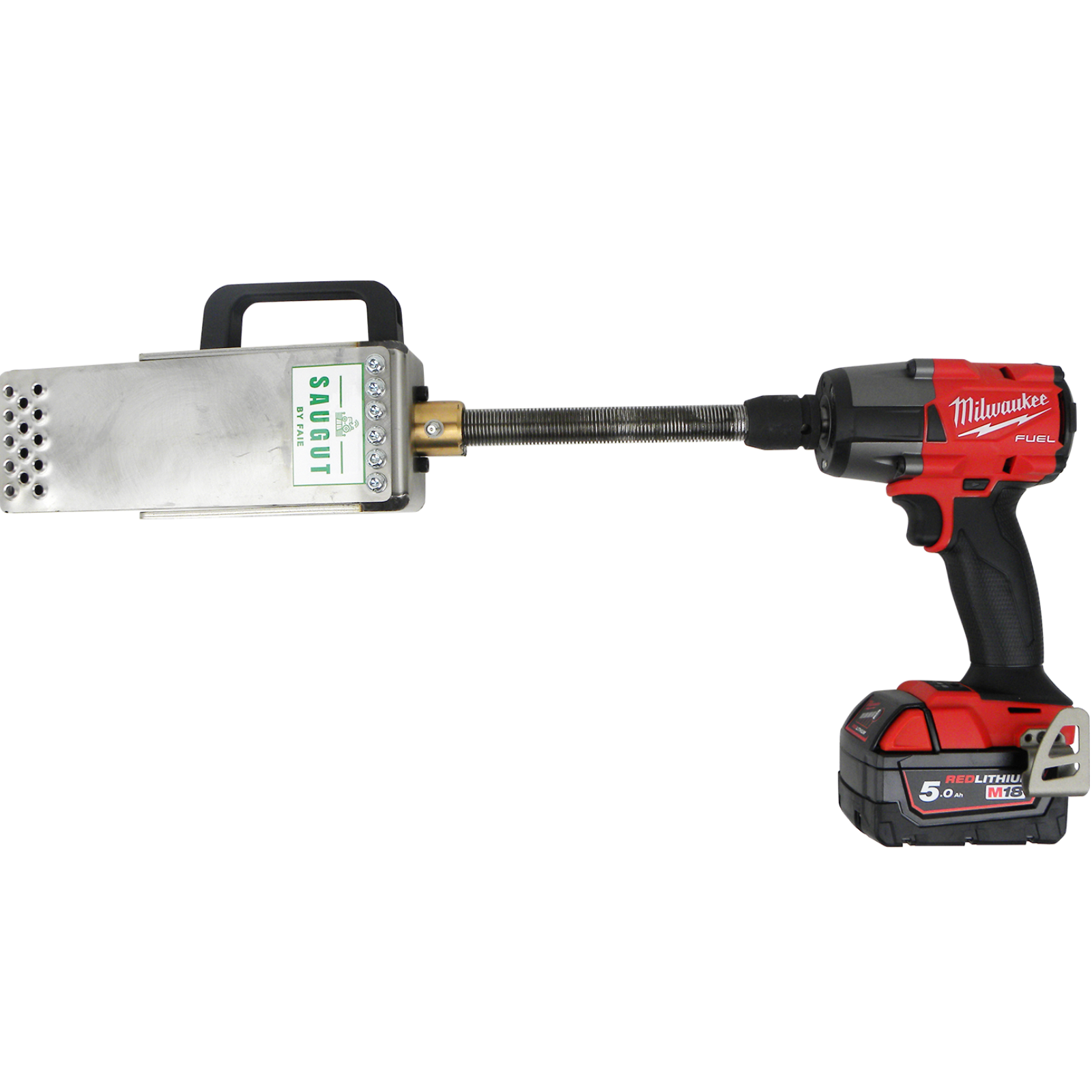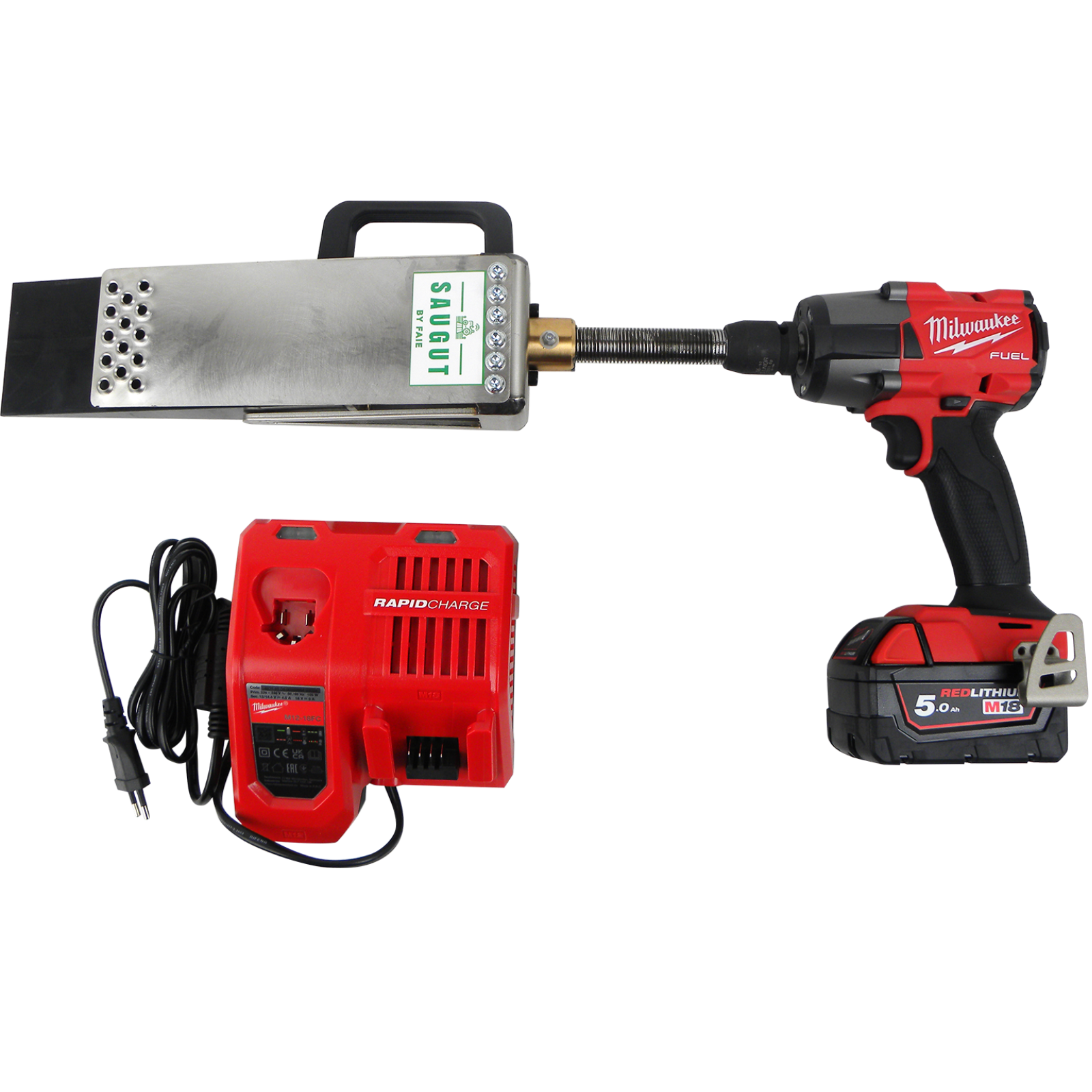 Stabiler SAUGUT Fällkeil im Set mit Milwaukee Akku-Schlagschrauber!Das Set besteht aus: - SAUGUT 20t Spindel-Fällkeil, FAIE Art.Nr. 127441 - Milwaukee Schlagschrauber M18FMTIW2F12 - Milwaukee Ladegerät M12-18FC Rapid Charge - 1 x