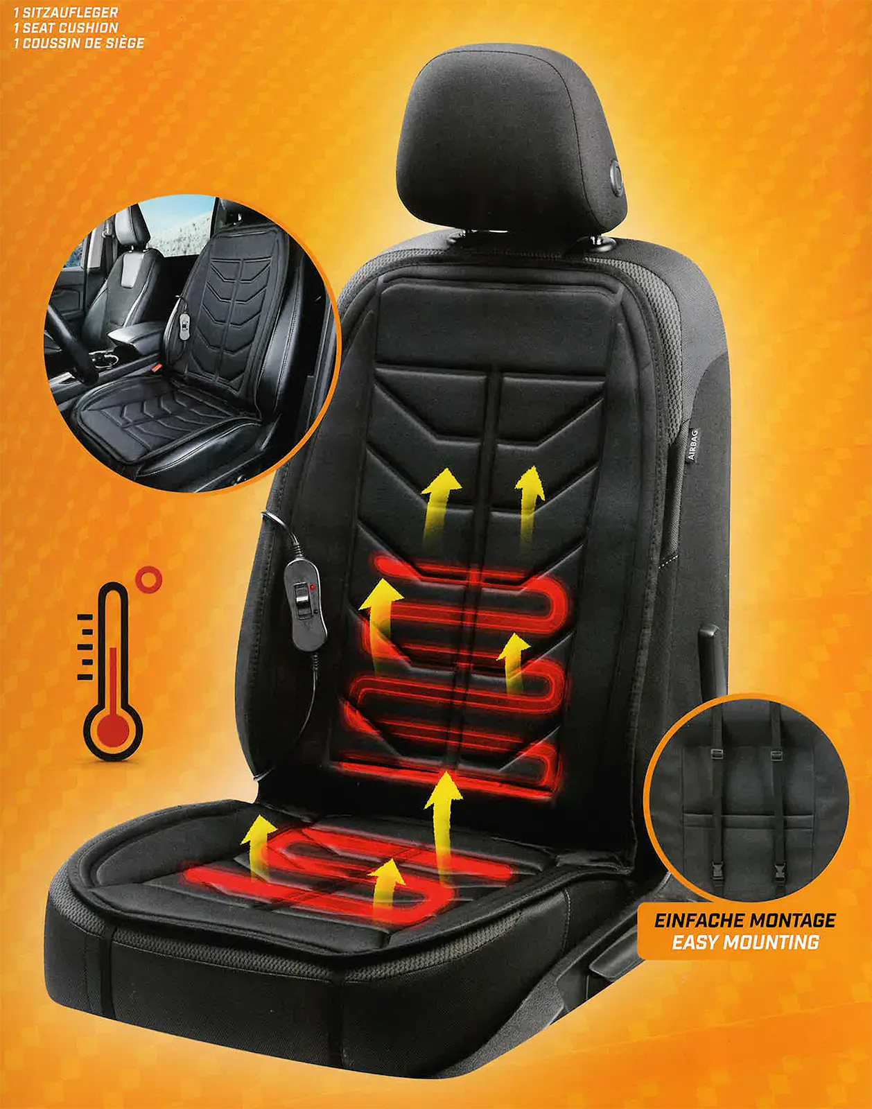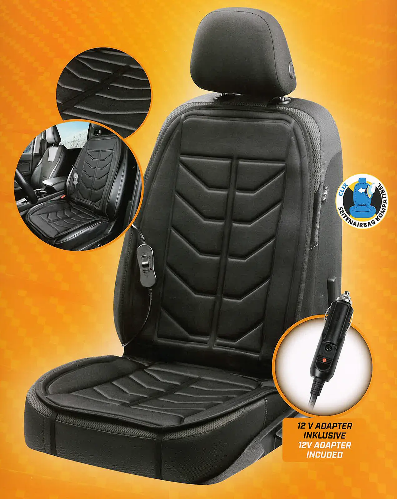 12 V / 34 W, anzustecken am Zigarettenanzünder, mit eingebautem Thermostat, incl. Überhitzungsschutz. Für angenehme Wärme und mehr Sitzkomfort.