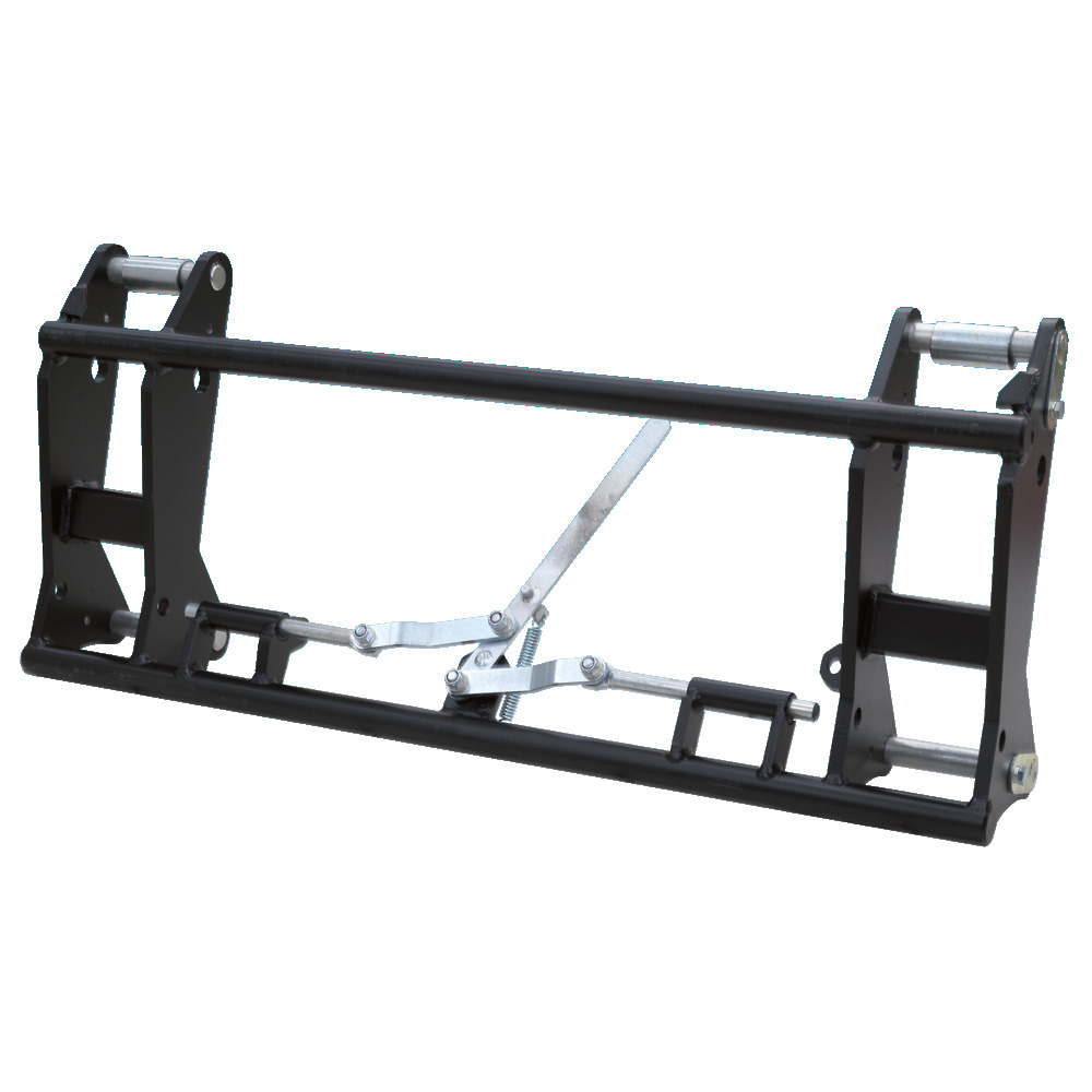 Einfaches und schnelles An- und Abkuppeln für Arbeitsgeräte am Frontlader der Kategorie 2 und 3. Die oberen Aufnahmebolzen ermöglichen durch Umstecken eine individuelle Kippwinkelverstellung. Weiters verfügt der Schnellwechselrahmen über eine mechanische Zentralverriegelung. Aufnahmebolzen frontladerseitig 30 mm, Aufnahmewelle geräteseitig 40 mm, Anbaubreite der Frontladerschwinge Innen minimal 855 mm und außen max. 1120 mm, Verriegelungsbolzen-Ø 20 mm, Gesamtbreite 1155 mm, Gewicht 59 kg. Bei einem Lastschwerpunkt von 800 mm beträgt die Tragkraft ca. 3000 kg.Der Schnellwechselrahmen in Verbindung mit einer hydraulischen Betätigung ermöglicht einen kostengünstigen Umbau auf einen vollhydraulisch gesteuerten modernen Lader. Dadurch ergibt sich für Ihren alten Frontlader ein umfangreiches neues Einsatzgebiet. Sie erhöhen mit der EURO-Aufnahme die Schlagkraft und weiten die Einsatzmöglichkeit Ihres alten Frontladers um viele Bereiche aus.