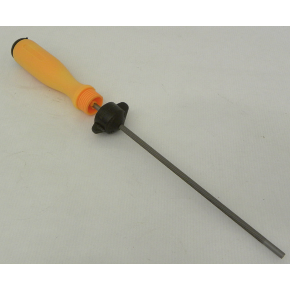 Mit geschraubtem Klemmhalter für festen Halt der Feile (ohne Feile), einfach zu wechseln, für alle gängigen Größen, mit 30° und 35° Winkel an der Spitze. Länge 125 mm.