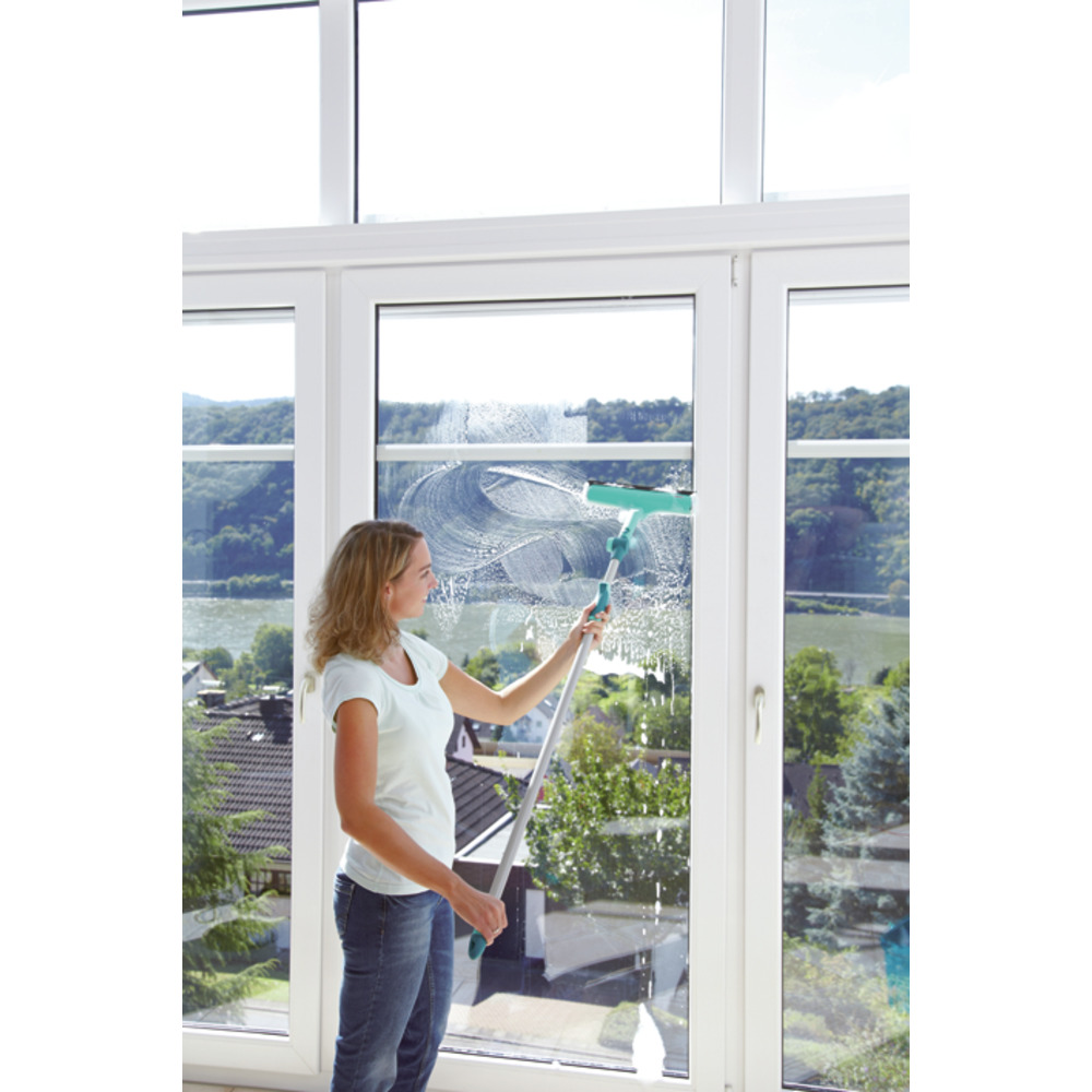Nach dem Einwaschen der Fenster sorgt die extrabreite Gummilippe dafür, dass Sie die Glasflächen streifenfrei abziehen können. Das Ergebnis: klare Sicht und strahlend saubere Fenster.