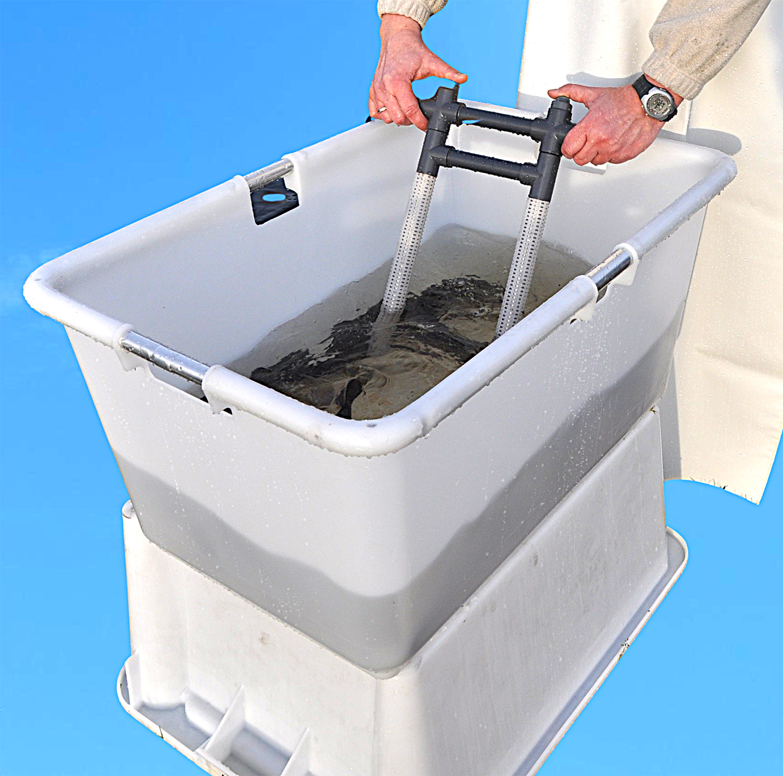 Die Betäubung erfolgt komfortabel per Knopfdruck über die Handelektrode und kann in jedem geeigneten Kunststoffbehälter durchgeführt werden.