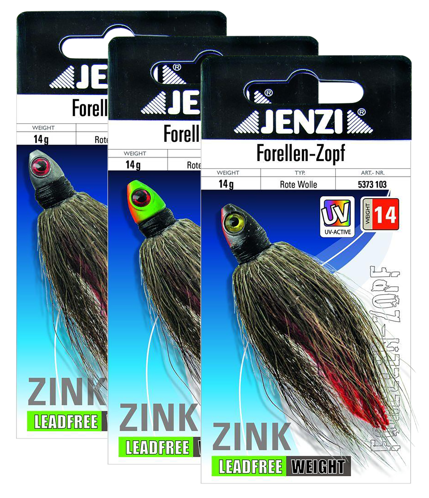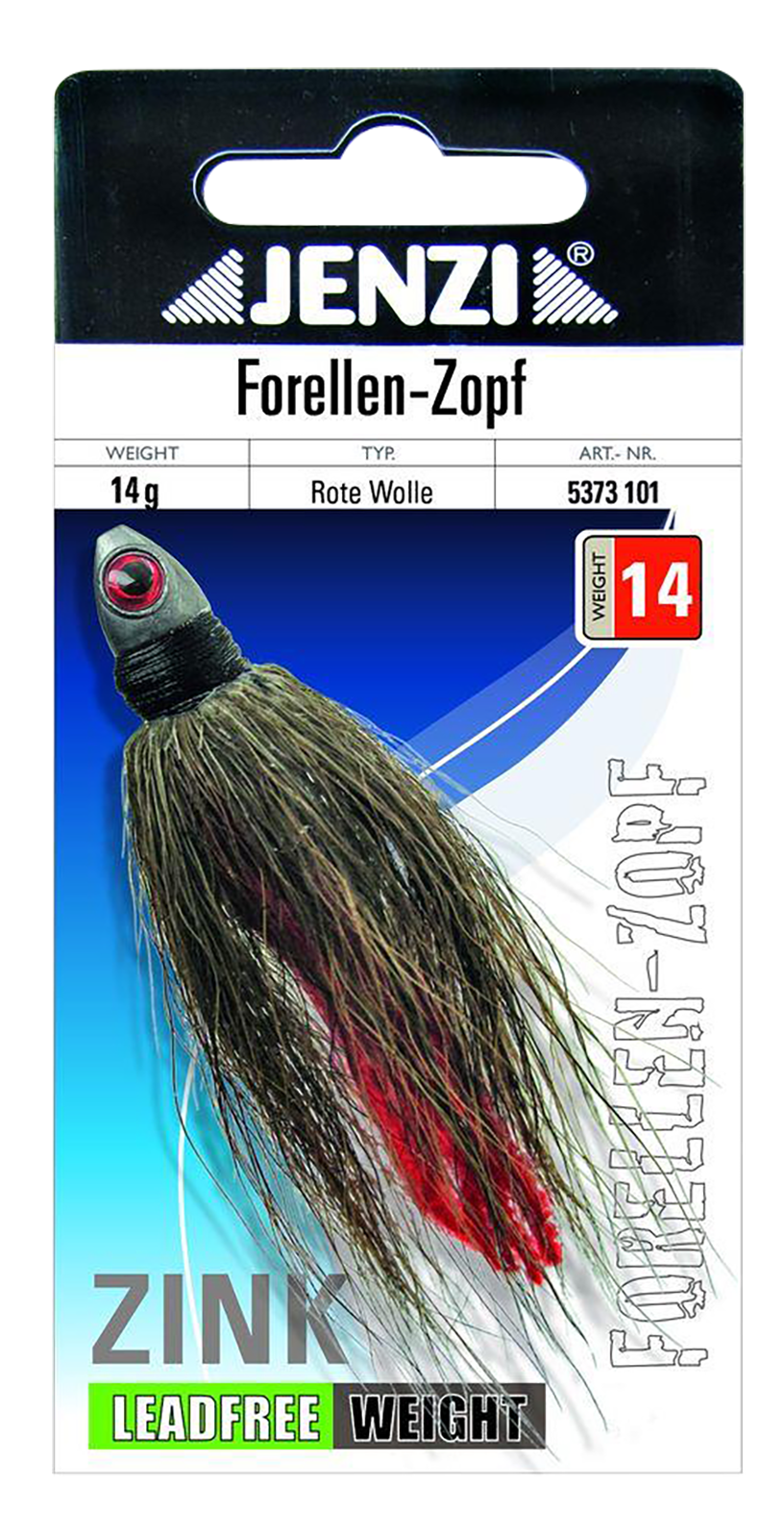 Gefertigt aus hochwertigem Zink – ganz ohne Blei. Diese altbewährte Spezialität eignet sich perfekt zum Fang von Forellen in klaren Gebirgsbächen und Seen. Der Zopf wird von Hand gebunden, mit feinem Rehhaar und einem roten Wollstreifen für extra Lockwirkung.